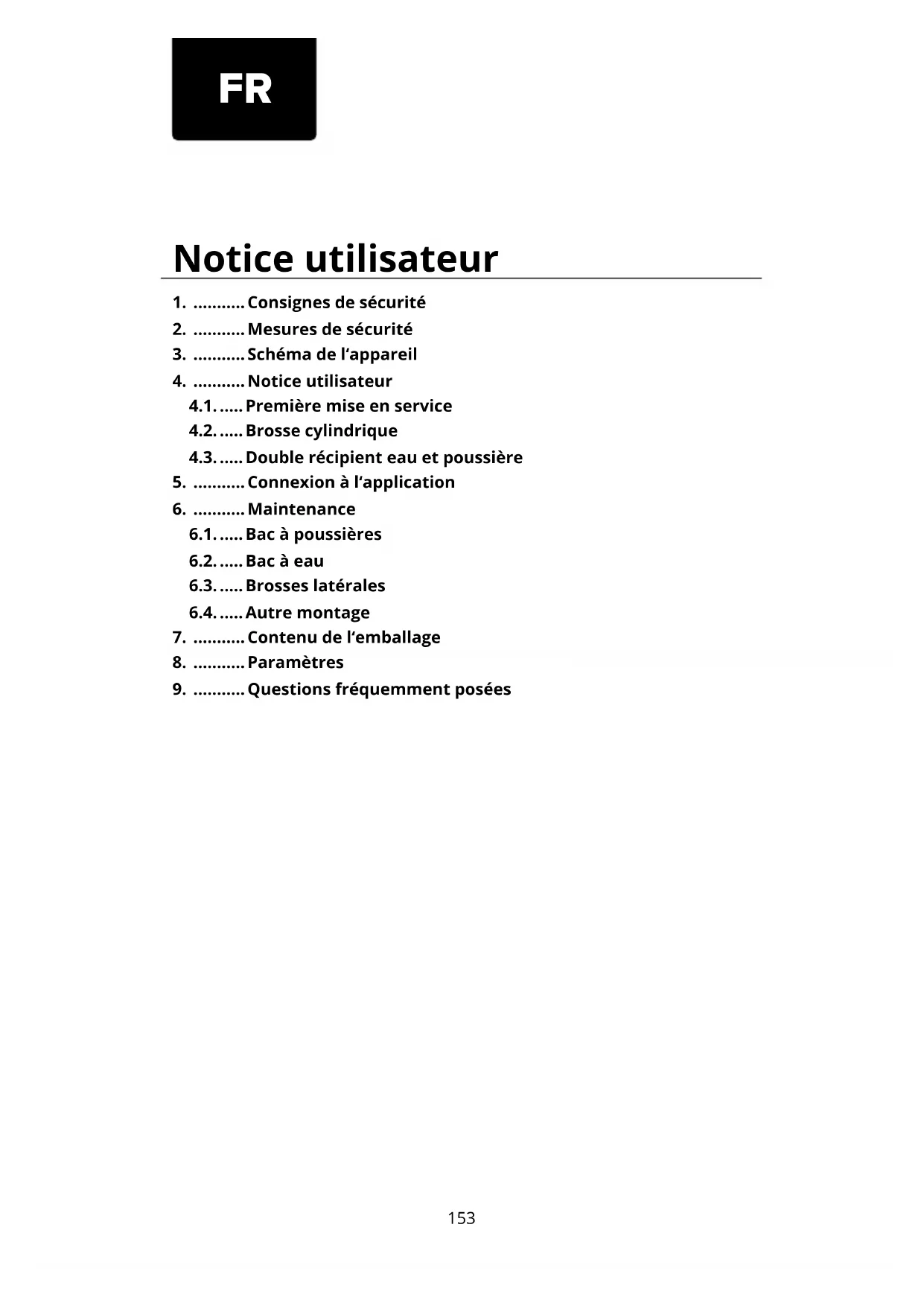 | Maintenance | Filtre HEPA lavable, brosses latérales remplaçables, vidange du réservoir recommandée après chaque utilisation. |
