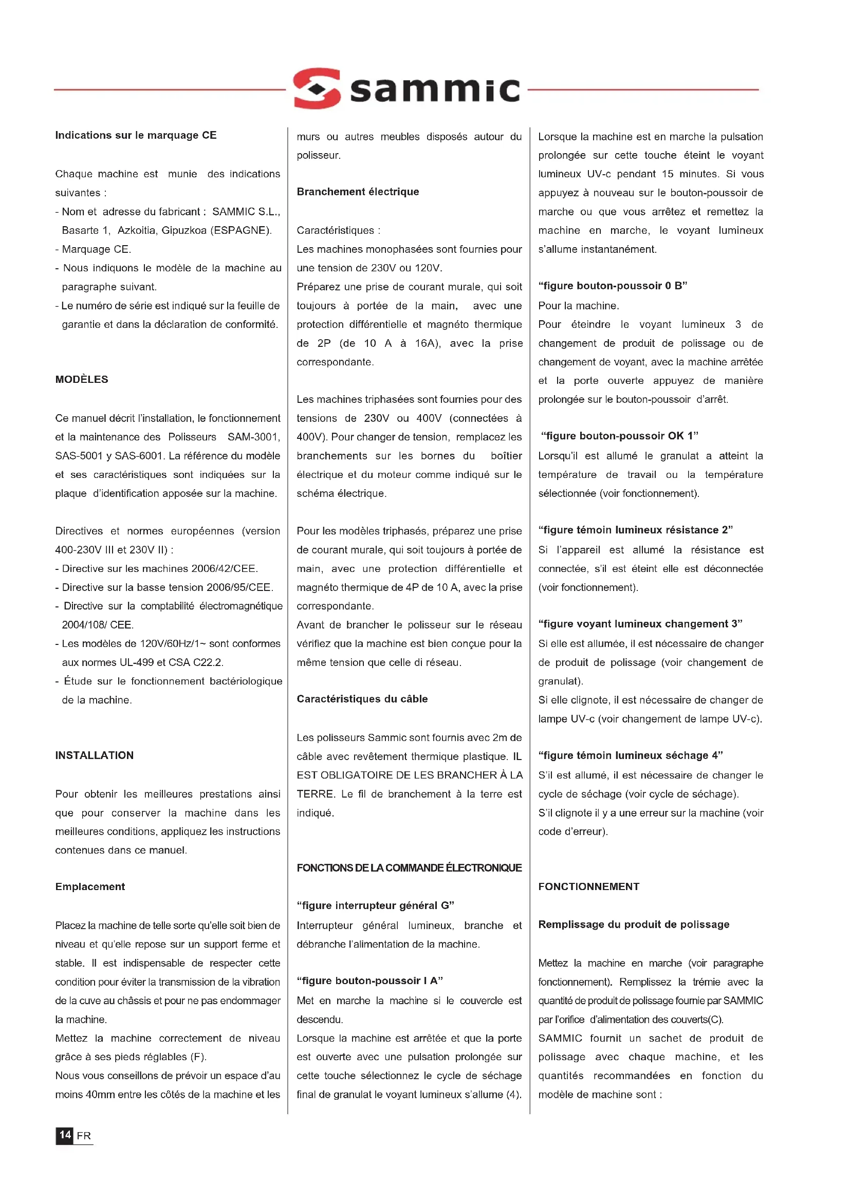 DEIndications sur le marquage CE Chaque machine est munie des indications suivantes : - Nom et adresse du fabricant : SAMMIC S.L., Basarte 1, Azkoitia, Gipuzkoa (ESPAGNE). - Marquage CE. - Nous indiquons le modèle de la machine au paragraphe suivant. - Le numéro de série est indiqué sur la feuille de garantie et dans la déclaration de conformité. MODÈLES Ce manuel décrit l’installation, le fonctionnement et la maintenance des Polisseurs SAM-3001, SAS-5001 y SAS-6001. La référence du modèle et ses caractéristiques sont indiquées sur la plaque d’identification apposée sur la machine. Directives et normes européennes (version 400-230V III et 230V II) : - Directive sur les machines 2006/42/CEE. - Directive sur la basse tension 2006/95/CEE. - Directive sur la comptabilité électromagnétique 2004/108/ CEE. - Les modèles de 120V/60Hz/1~ sont conformes aux normes UL-499 et CSA C22.2. - Étude sur le fonctionnement bactériologique de la machine. INSTALLATION Pour obtenir les meilleures prestations ainsi que pour conserver la machine dans les meilleures conditions, appliquez les instructions contenues dans ce manuel. Emplacement Placez la machine de telle sorte qu’elle soit bien de niveau et qu’elle repose sur un support ferme et stable. Il est indispensable de respecter cette condition pour éviter la transmission de la vibration de la cuve au châssis et pour ne pas endommager la machine. Mettez la machine correctement de niveau grâce à ses pieds réglables (F). Nous vous conseillons de prévoir un espace d’au moins 40mm entre les côtés de la machine et les murs ou autres meubles disposés autour du polisseur. Branchement électrique Caractéristiques : Les machines monophasées sont fournies pour une tension de 230V ou 120V. Préparez une prise de courant murale, qui soit toujours à portée de la main, avec une protection différentielle et magnéto thermique de 2P (de 10 A à 16A), avec la prise correspondante. Les machines triphasées sont fournies pour des tensions de 230V ou 400V (connectées à 400V). Pour changer de tension, remplacez les branchements sur les bornes du boîtier électrique et du moteur comme indiqué sur le schéma électrique. Pour les modèles triphasés, préparez une prise de courant murale, qui soit toujours à portée de main, avec une protection différentielle et magnéto thermique de 4P de 10 A, avec la prise correspondante. Avant de brancher le polisseur sur le réseau vérifiez que la machine est bien conçue pour la même tension que celle di réseau. Caractéristiques du câble Les polisseurs Sammic sont fournis avec 2m de câble avec revêtement thermique plastique. IL