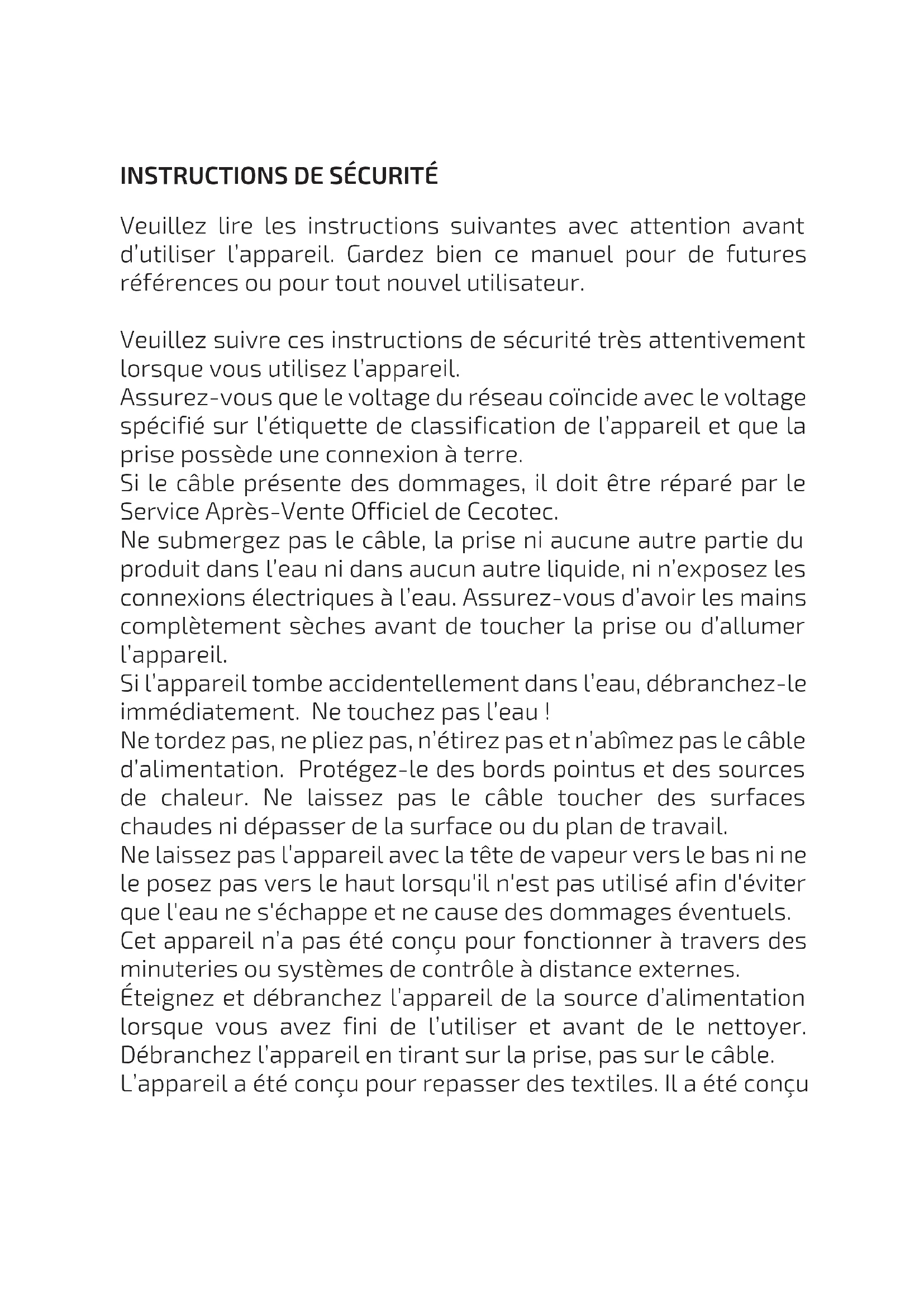 quality control tests previous to their commercialisation. These tests consist of filling the water tank in order to check tightness and to ensure correct operating of the device. Once the test has been carried out, the tank is emptied and dried, but there is a slight probability that water could remain inside it. 05519_Fast&Furious 4050 X-Treme_Manual_YV_01200525.indd 1005519_Fast&Furious 4050 X-Treme_Manual_YV_01200525.indd 10 26/5/20 13:0526/5/20 13:05INSTRUCTIONS DE SÉCURITÉ Veuillez lire les instructions suivantes avec attention avant d’utiliser l’appareil. Gardez bien ce manuel pour de futures références ou pour tout nouvel utilisateur. Veuillez suivre ces instructions de sécurité très attentivement lorsque vous utilisez l’appareil. Assurez-vous que le voltage du réseau coïncide avec le voltage spécifié sur l’étiquette de classification de l’appareil et que la prise possède une connexion à terre. Si le câble présente des dommages, il doit être réparé par le Service Après-Vente Officiel de Cecotec. Ne submergez pas le câble, la prise ni aucune autre partie du produit dans l’eau ni dans aucun autre liquide, ni n’exposez les connexions électriques à l’eau. Assurez-vous d’avoir les mains complètement sèches avant de toucher la prise ou d’allumer l’appareil. Si l’appareil tombe accidentellement dans l’eau, débranchez-le immédiatement. Ne touchez pas l’eau ! Ne tordez pas, ne pliez pas, n’étirez pas et n’abîmez pas le câble d’alimentation. Protégez-le des bords pointus et des sources de chaleur. Ne laissez pas le câble toucher des surfaces chaudes ni dépasser de la surface ou du plan de travail. Ne laissez pas l’appareil avec la tête de vapeur vers le bas ni ne le posez pas vers le haut lorsqu'il n'est pas utilisé afin d'éviter que l'eau ne s'échappe et ne cause des dommages éventuels. Cet appareil n’a pas été conçu pour fonctionner à travers des minuteries ou systèmes de contrôle à distance externes. Éteignez et débranchez l’appareil de la source d’alimentation lorsque vous avez fini de l’utiliser et avant de le nettoyer. Débranchez l’appareil en tirant sur la prise, pas sur le câble. L’appareil a été conçu pour repasser des textiles. Il a été conçu 05519_Fast&Furious 4050 X-Treme_Manual_YV_01200525.indd 1105519_Fast&Furious 4050 X-Treme_Manual_YV_01200525.indd 11 26/5/20 13:0526/5/20 13:05pour un usage domestique, et donc, il ne convient pas pour un usage commercial. Ne l’utilisez pas en extérieurs. Pour éviter des brûlures ou des dommages, ne repassez pas les vêtements tout en les portant. Faites attention lorsque vous inclinez ou renversez le produit, il pourrait contenir encore de l’eau chaude. Ne bougez pas brusquement le produit pour ne pas renverser le contenu. Placez l’appareil sur une surface sèche, stable, plate et résistante à la chaleur. La température des surfaces accessibles pourrait être élevée lorsque vous utilisez l’appareil et pourrait provoquer des brûlures. Ne touchez pas les surfaces chaudes lorsque l’appareil est en fonctionnement ni immédiatement après. Ne dirigez pas la vapeur vers les personnes ou les animaux. Ne repassez pas les vêtements en les portant pour éviter de vos brûler. Ne laissez pas l'appareil sans surveillance lorsqu’il est en fonctionnement. Débranchez l’appareil lorsque vous avez terminé de l’utiliser et lorsque vous sortez de la pièce dans laquelle il est installé. N’utilisez pas le produit avec le réservoir vide. Évitez le contact entre le câble d’alimentation et la vapeur à haute température pendant le repassage. Pour éviter des brûlures ou des dommages, ne dirigez pas la vapeur vers les personnes ou vers les animaux lorsque vous repassez. N’utilisez pas le produit avec du parfum, vinaigre ni autres liquides. Ce produit est conçu pour fonctionner uniquement avec de l’eau. N’essayez pas de réparer l’appareil vous-même. Veuillez contacter le Service Après-Vente Officiel de Cecotec pour tout doute ou renseignement. 05519_Fast&Furious 4050 X-Treme_Manual_YV_01200525.indd 1205519_Fast&Furious 4050 X-Treme_Manual_YV_01200525.indd 12 26/5/20 13:0526/5/20 13:05Pour assurer le correct fonctionnement de l’appareil, le nettoyage et l’entretien doivent être réalisés en accord avec ce manuel d’instructions. Éteignez et débranchez l'appareil avant de le monter, démonter ou nettoyer. Assurez-vous que l’appareil ait refroidi complètement avant de le garder. Ne repassez pas de tissus comme le cuir, le daim, le vinyle, le plastique ou d’autres qui soient sensibles à la vapeur. Le nettoyage et l’entretien ne doivent pas être réalisés par des enfants. Gardez l’appareil et son manuel d’instructions dans un lieu sec et sécurisé lorsque vous n’allez pas l’utiliser. Cecotec n’acceptera aucune responsabilité quant aux dommages et lésions liés à une utilisation inadéquate du produit. Toute utilisation incorrecte ou tout non-respect de ce manuel annulera la garantie du produit et les responsabilités du fabricant. L’appareil ne doit pas être utilisé par des enfants de 0 à 8 ans. Il peut être utilisé par des enfants de 8 ans et plus s’ils sont surveillés constamment. Cet appareil peut être utilisé par des personnes aux capacités physiques, mentales ou sensorielles réduites, ou sans expérience ni connaissances si elles sont surveillées et/ou ont reçu les informations nécessaires à sa correcte utilisation et qu’elles ont bien compris les risques qu’il implique. Surveillez les enfants pour vous assurer qu’ils ne jouent pas avec l’appareil. Une surveillance stricte est nécessaire si le produit est utilisé par ou à côté des enfants. Maintenez l’appareil et son câble hors de portée des enfants de moins de 8 ans.