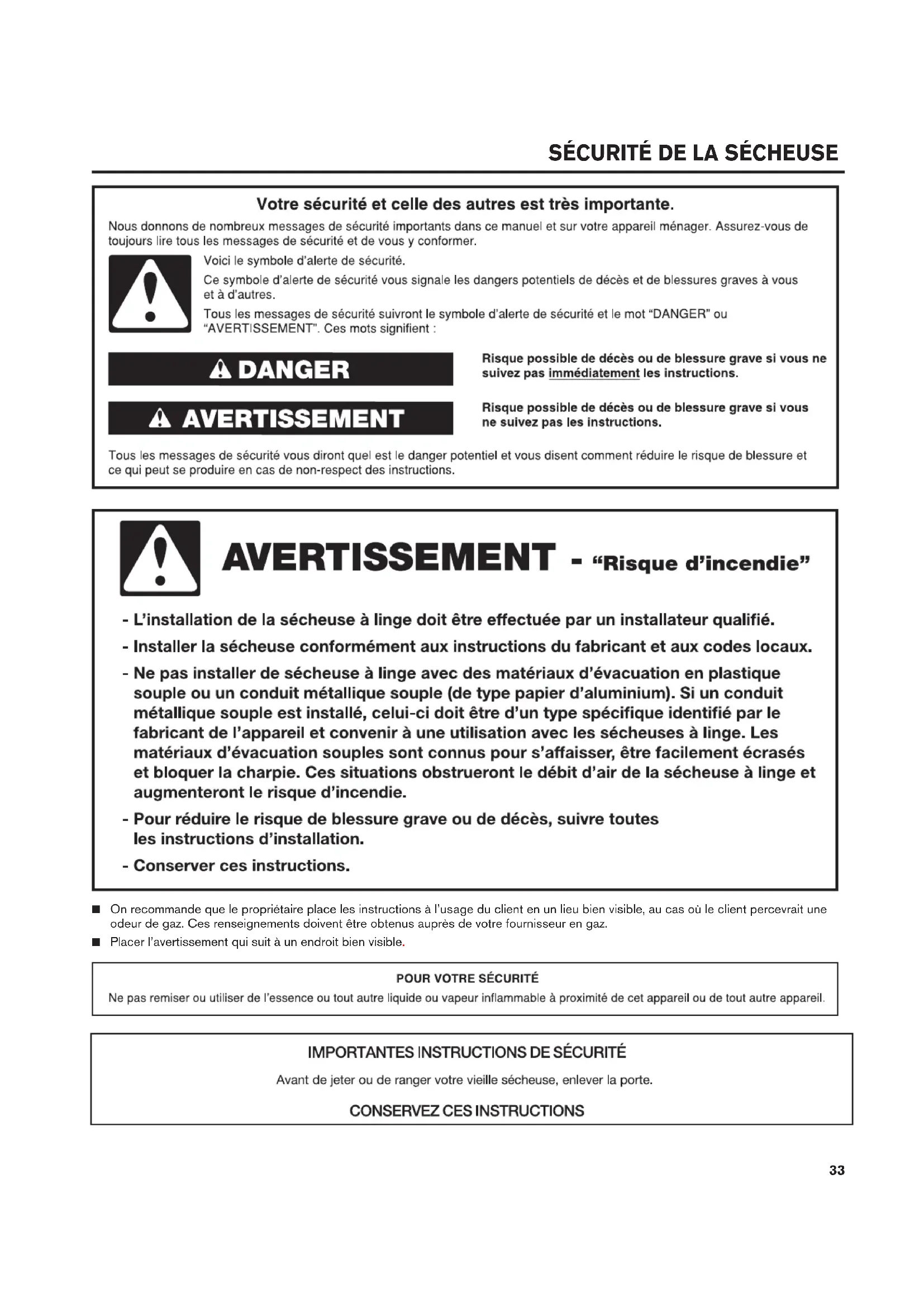 ■ Lire toutes les instructions avant d’utiliser la sécheuse. ■ Cette sécheuse est conçue uniquement pour le séchage de vêtements et de textiles ayant été nettoyés à l’eau. Ne pas l’utiliser à toute autre fin. ■ AVERTISSEMENT : Si l’on détecte une odeur de gaz, ne pas utiliser la sécheuse ou tout autre équipement électrique situé à proximité. Avertir les autres personnes qu’elles doivent évacuer cette zone. Contacter le propriétaire de la sécheuse immédiatement. ■ Ne pas placer des articles exposés aux huiles de cuisson dans votre sécheuse. Les articles contaminés par des huiles de cuisson peuvent contribuer à une réaction chimique qui pourrait causer à la charge de s’enflammer. ■ Ne pas faire sécher des articles qui ont été nettoyés ou lavés avec de l’essence ou imbibés d’essence, solvants de nettoyage à sec, ou autres substances inflammables ou explosives; ces substances peuvent émettre des vapeurs susceptibles de s’enflammer ou d’exploser. ■ Ne pas faire sécher dans la sécheuse des articles nonlavés. ■ Ne pas laisser des enfants jouer sur ou à l’intérieur de la sécheuse. Bien surveiller les enfants lorsque la sécheuse est utilisée à proximité d’enfants. ■ Avant de retirer la sécheuse pour un dépannage ou pour le jeter, ôter les portes des compartiments de la sécheuse. ■ Ne pas tenter d’atteindre un article à l’intérieur de la cuve de la sécheuse lorsque le tambour est en mouvement. ■ Ne pas ouvrir le couvercle lorsque la sécheuse est en marche. Il s’arrêtera. ■ Ne pas installer ou remiser cette sécheuse à un endroit où il serait exposée à l’eau et/ou aux intempéries. ■ Ne pas modifier les organes de commande. ■ Nettoyer le filtre à charpie avant et après chaque charge.36