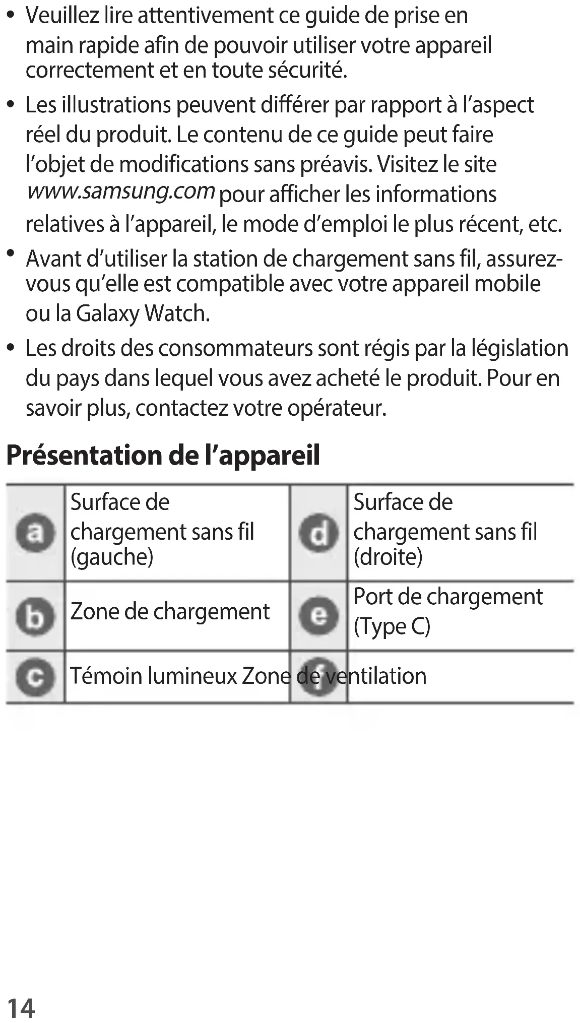 Les droits des consommateurs sont régis par la législation du pays dans lequel vous avez acheté le produit. Pour en savoir plus, contactez votre opérateur. Présentation de l’appareil Surface de chargement sans fil (gauche) Surface de chargement sans fil (droite) Zone de chargement Port de chargement (Type C) Témoin lumineux Zone de ventilation Français15 Français Utiliser la station de chargement sans fil