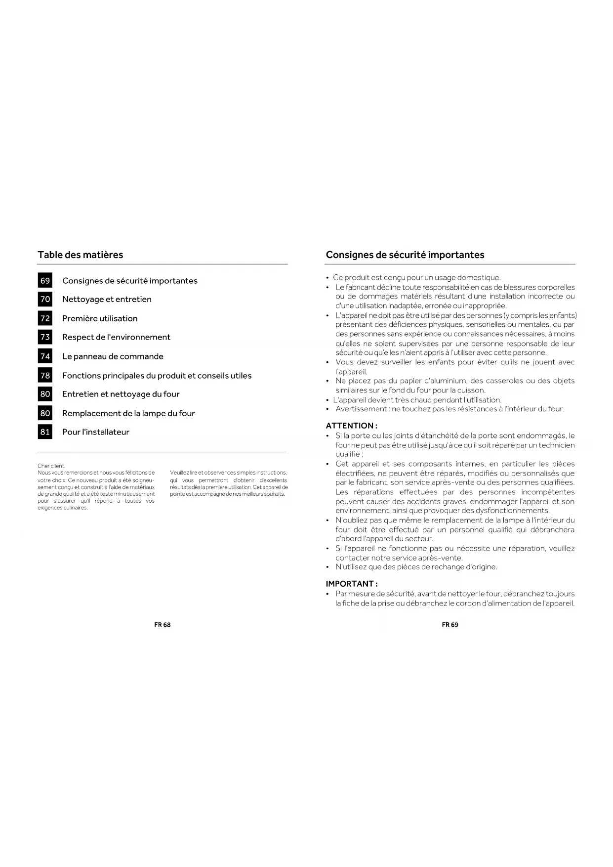 Cher client, Nous vous remercions et nous vous félicitons de votre choix. Ce nouveau produit a été soigneu-sement conçu et construit à l'aide de matériaux de grande qualité et a été testé minutieusement pour s'assurer qu'il répond à toutes vos exigences culinaires. Veuillez lire et observer ces simples instructions, qui vous permettront d'obtenir d'excellents résultats dès la première utilisation. Cet appareil de pointe est accompagné de nos meilleurs souhaits. FR 69 Consignes de sécurité importantes