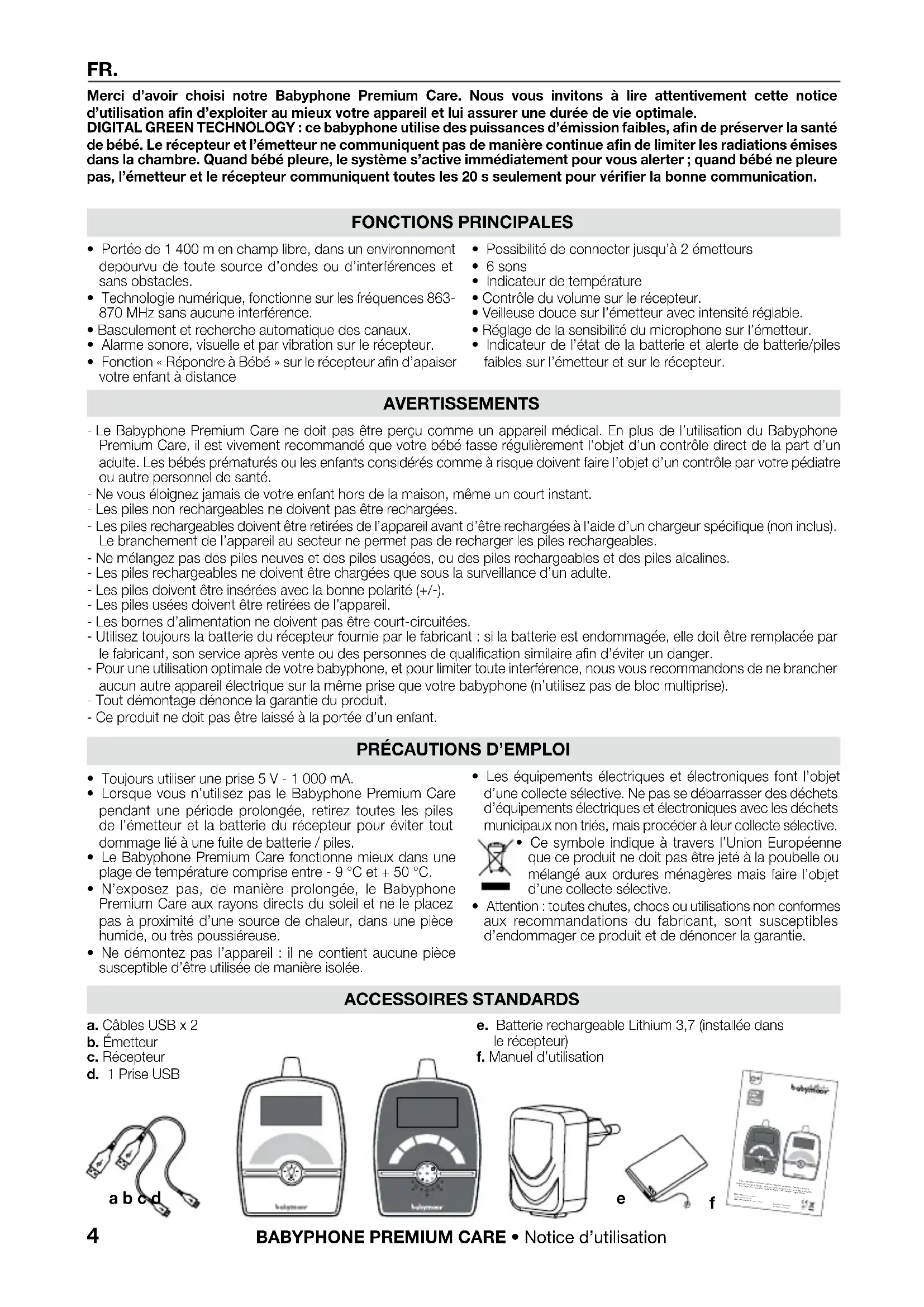 Merci d’avoir choisi notre Babyphone Premium Care. Nous vous invitons à lire attentivement cette notice d’utilisation afin d’exploiter au mieux votre appareil et lui assurer une durée de vie optimale. DIGITAL GREEN TECHNOLOGY : ce babyphone utilise des puissances d’émission faibles, afin de préserver la santé de bébé. Le récepteur et l’émetteur ne communiquent pas de manière continue afin de limiter les radiations émises dans la chambre. Quand bébé pleure, le système s’active immédiatement pour vous alerter ; quand bébé ne pleure pas, l’émetteur et le récepteur communiquent toutes les 20 s seulement pour vérifier la bonne communication. FR.5