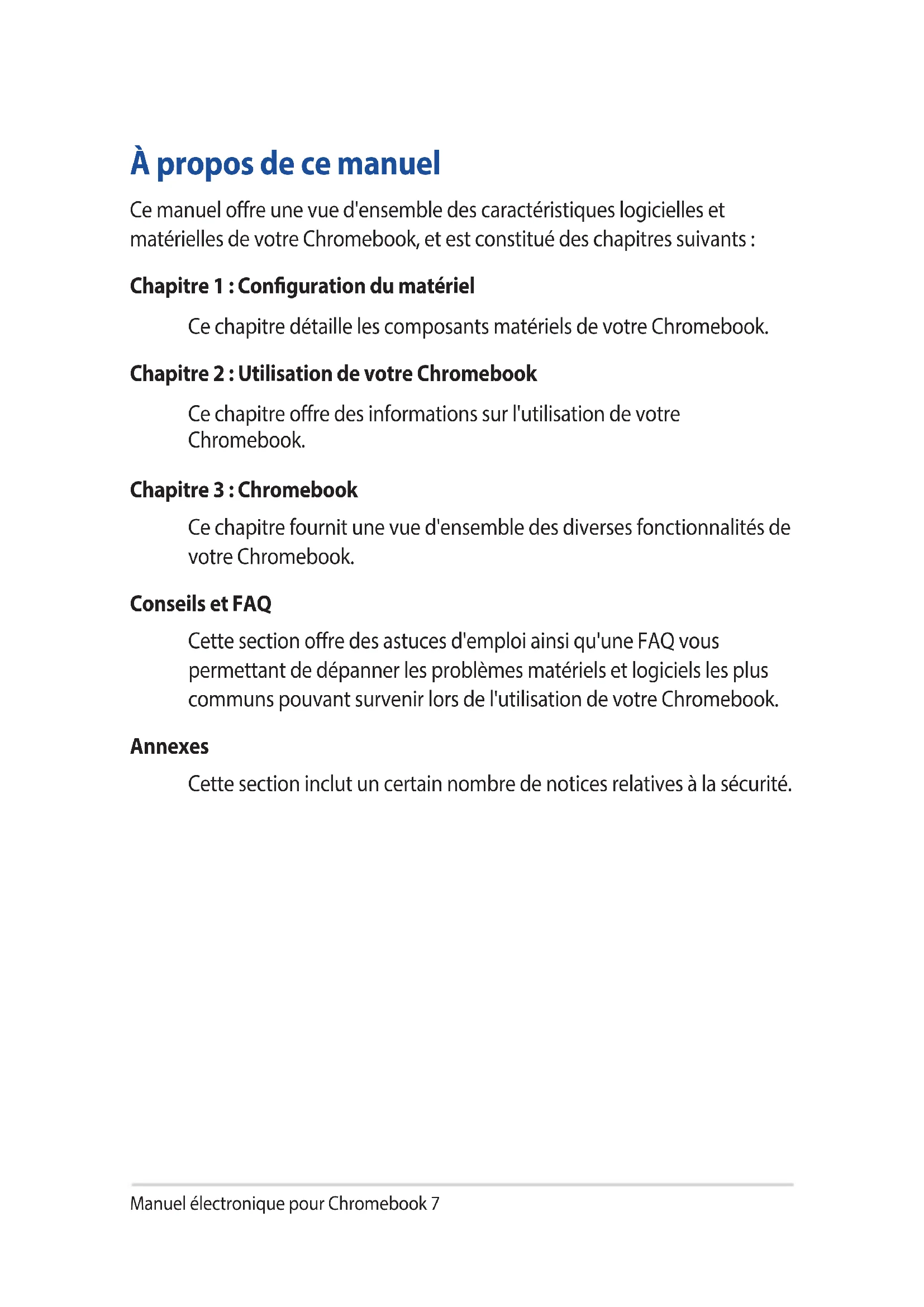- Déclaration simpliée de conformité de l'UE Manuel électronique pour Chromebook 7 À propos de ce manuel Ce manuel ore une vue d'ensemble des caractéristiques logicielles et matérielles de votre Chromebook, et est constitué des chapitres suivants : p. 93