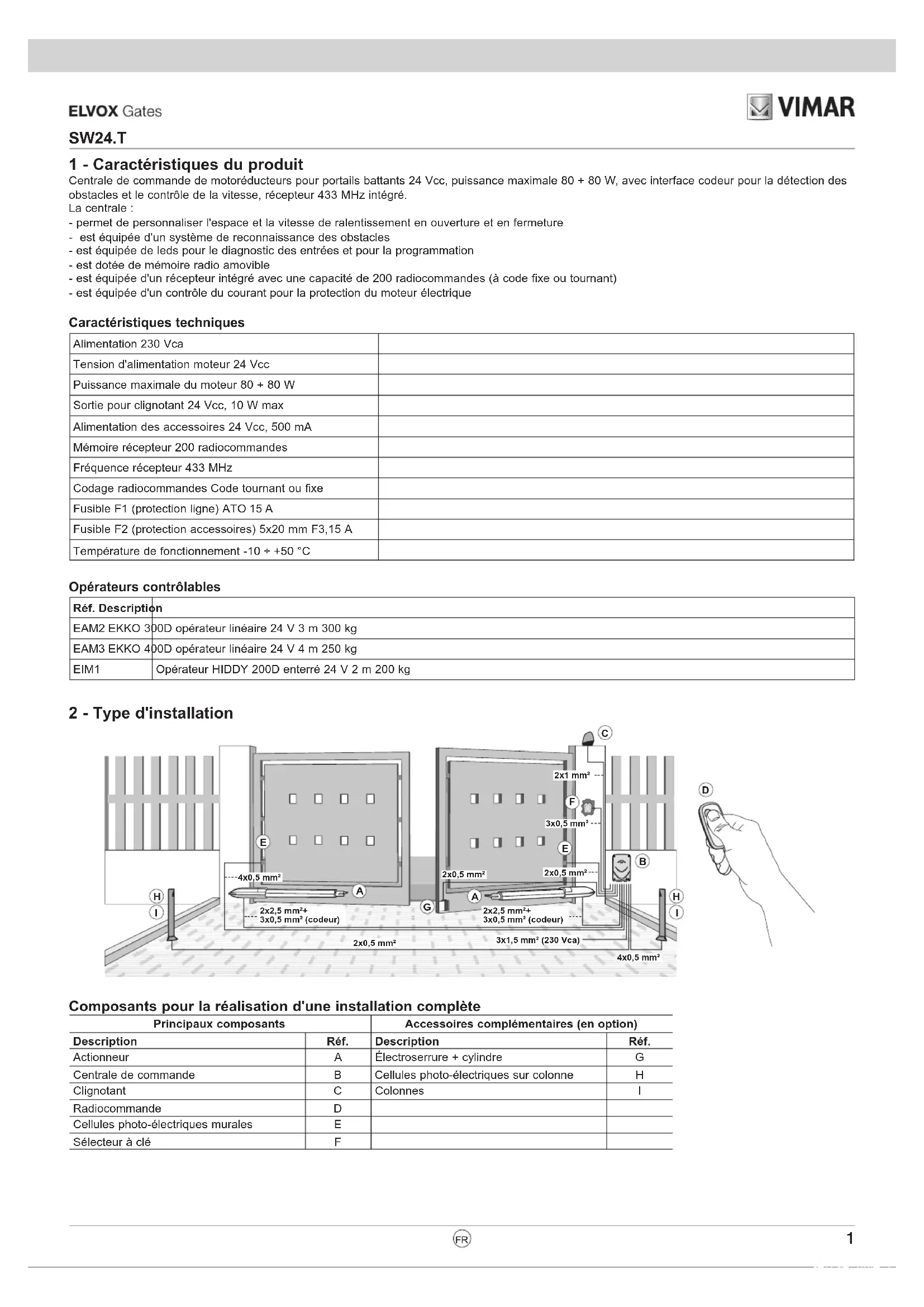2x2,5 mm²+3x0,5 mm² (codeur) 2x0,5 mm²2x0,5 mm²4x0,5 mm²2x0,5 mm²3x1,5 mm² (230 Vca)2x2,5 mm²+3x0,5 mm² (codeur) Composants pour la réalisation d'une installation complète Principaux composants Accessoires complémentaires (en option) Description Réf. Description Réf. Actionneur A Électroserrure + cylindre G Centrale de commande B Cellules photo-électriques sur colonne H Clignotant C Colonnes I Radiocommande D Cellules photo-électriques murales E Sélecteur à clé F2 SW24.T