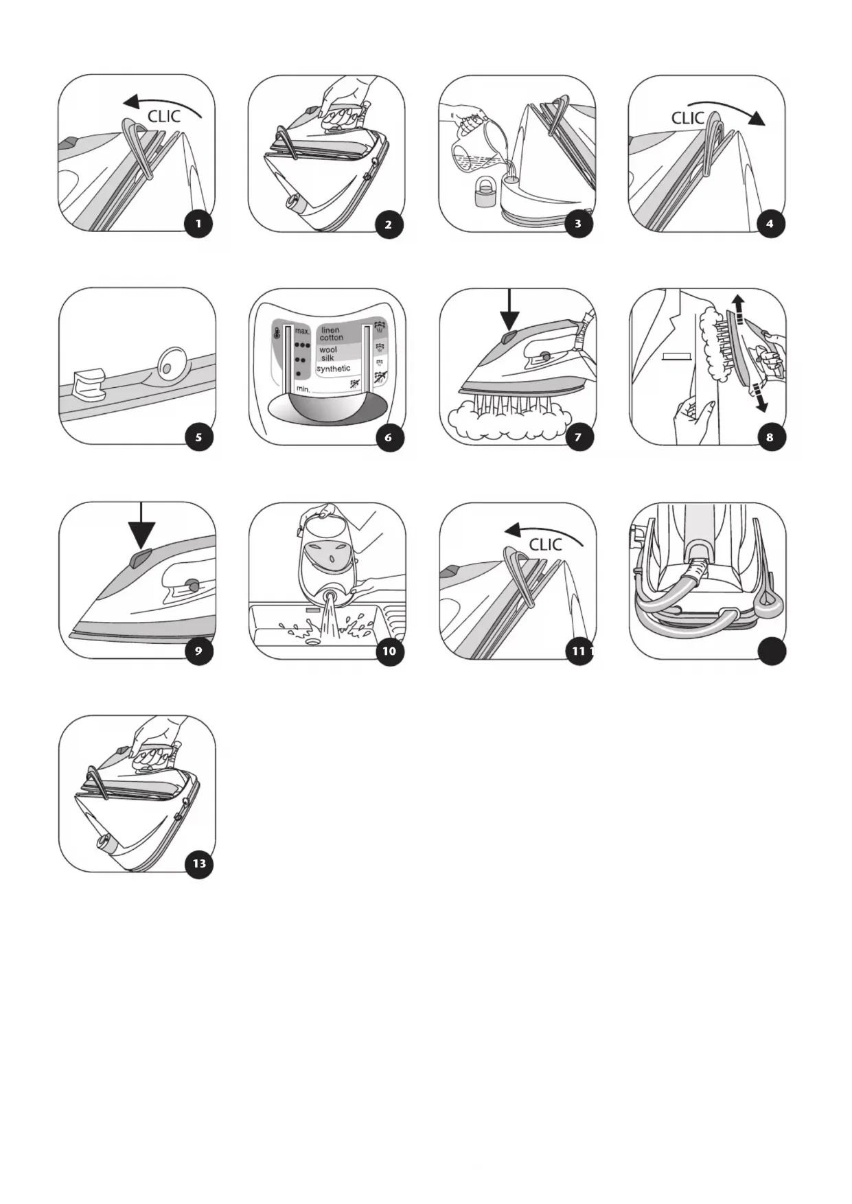 intermittence en effectuant un mouvement de haut en bas (8). Nos conseils : Pour les tissus autres que le lin ou le coton, maintenez le fer à quelques centimètres afin de ne pas brûler le tissu.
