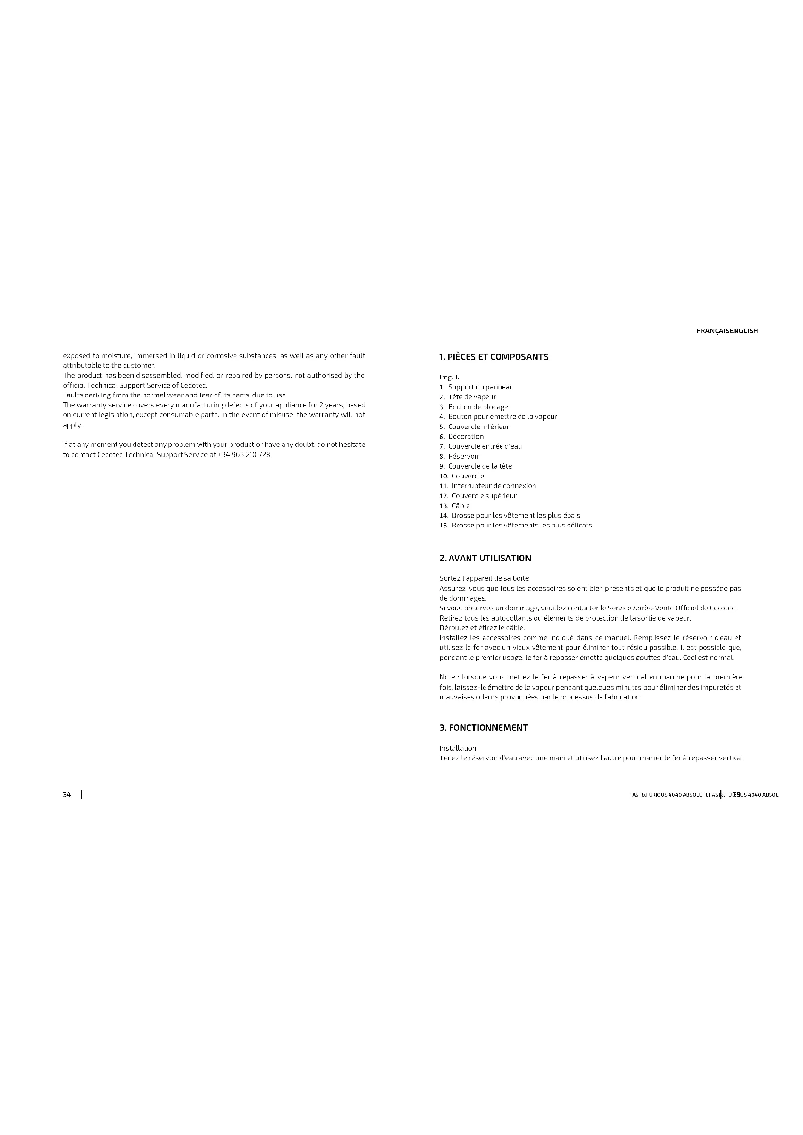 - Procédé de protection de température élevée ou basse de NTC. Veuillez contacter le Service Après-Vente de Cecotec. Le défroisseur vapeur ne chauffe pas. Vérifiez si l’interrupteur se trouve dans la bonne position et si l’appareil est bien assemblé. L’appareil n’émet pas de la vapeur. Vérifiez si le réservoir d’eau est bien installé. Vérifiez le niveau d’eau du réservoir d’eau. Appuyez sur le bouton de la vapeur avec plus de force. Le réservoir d’eau goutte. Assurez-vous que le niveau d’eau n’excède pas la marque du niveau maximum. Assurez-vous que le couvercle est correctement fermé. Suivez les instructions de sécurité de ce manuel et maintenez toujours le fer en position verticale. Les accessoires métalliques des vêtements se sont décolorés ou abîmés. N’utilisez pas l’appareil directement sur les objets métalliques. Utilisez la fonction de la vapeur avec modération si le vêtement possède d’accessoires métalliques.