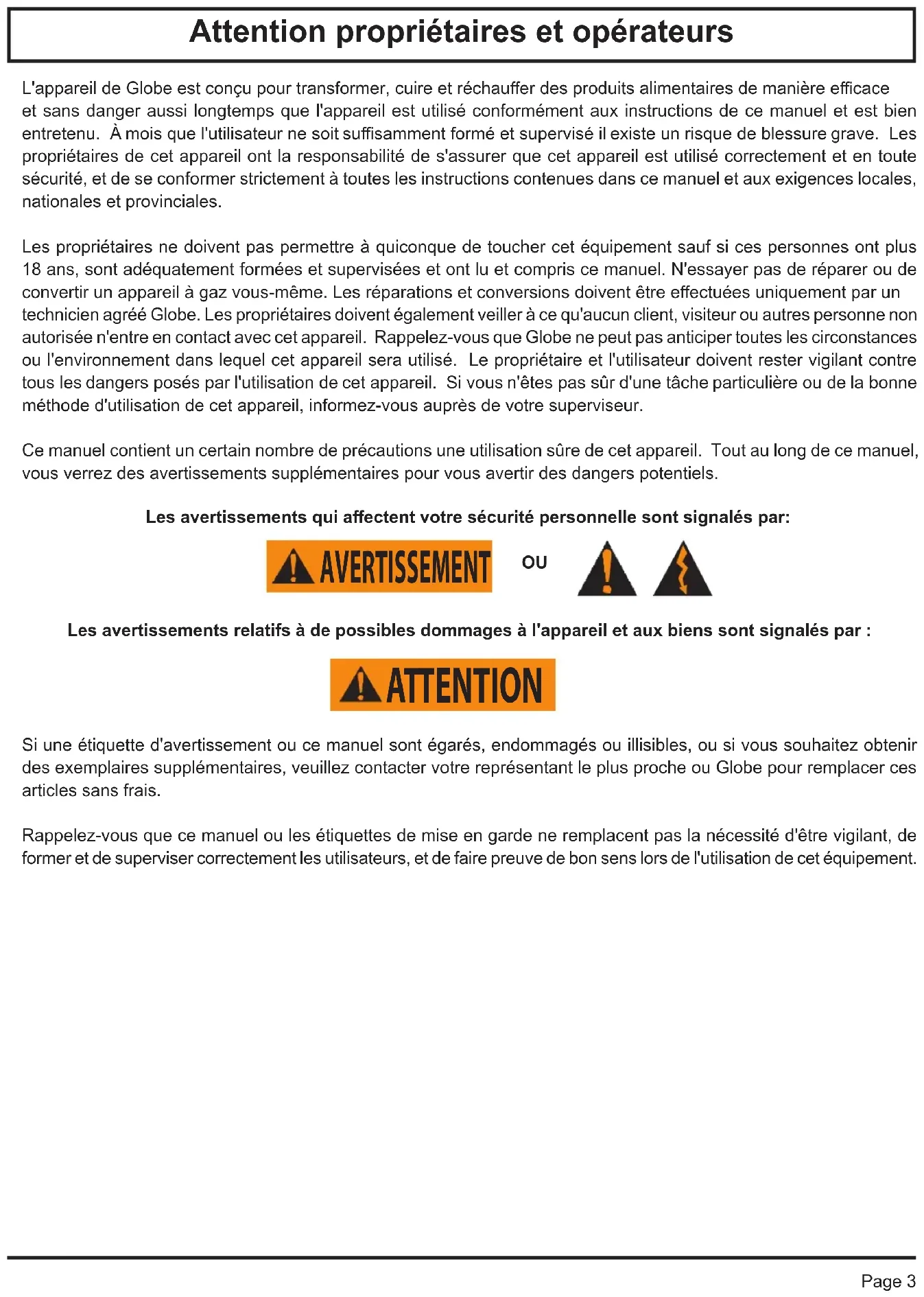 980196 Ver. 1 Rev. 5_2019 IndexPage 3 L'appareil de Globe est conçu pour transformer, cuire et réchauer des produits alimentaires de manière ecace et sans danger aussi longtemps que l'appareil est utilisé conformément aux instructions de ce manuel et est bien entretenu. À mois que l'utilisateur ne soit susamment formé et supervisé il existe un risque de blessure grave. Les propriétaires de cet appareil ont la responsabilité de s'assurer que cet appareil est utilisé correctement et en toute sécurité, et de se conformer strictement à toutes les instructions contenues dans ce manuel et aux exigences locales, nationales et provinciales. Les propriétaires ne doivent pas permettre à quiconque de toucher cet équipement sauf si ces personnes ont plus 18 ans, sont adéquatement formées et supervisées et ont lu et compris ce manuel. N'essayer pas de réparer ou de convertir un appareil à gaz vous-même. Les réparations et conversions doivent être eectuées uniquement par un technicien agréé Globe. Les propriétaires doivent également veiller à ce qu'aucun client, visiteur ou autres personne non autorisée n'entre en contact avec cet appareil. Rappelez-vous que Globe ne peut pas anticiper toutes les circonstances ou l'environnement dans lequel cet appareil sera utilisé. Le propriétaire et l'utilisateur doivent rester vigilant contre tous les dangers posés par l'utilisation de cet appareil. Si vous n'êtes pas sûr d'une tâche particulière ou de la bonne méthode d'utilisation de cet appareil, informez-vous auprès de votre superviseur. Ce manuel contient un certain nombre de précautions une utilisation sûre de cet appareil. Tout au long de ce manuel, vous verrez des avertissements supplémentaires pour vous avertir des dangers potentiels. Les avertissements qui aectent votre sécurité personnelle sont signalés par:
