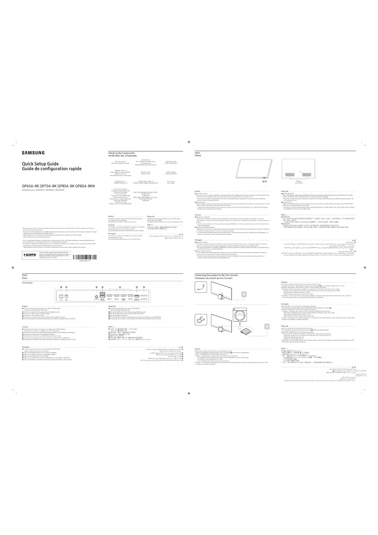 - La couleur et l’aspect du produit peuvent varier en fonction du modèle, et le contenu dans le manuel peut être modifié sans préavis pour des raisons d’amélioration des performances.* Téléchargez le mode d'emploi du site Web de Samsung Electronics pour de plus amples informations.The terms HDMI and HDMI High-Definition MultimediaInterface, and the HDMI Logo are trademarks or registeredtrademarks of HDMI Licensing Administrator, Inc. in theUnited States and other countries. Quick Setup GuideGuide de configuration rapideWarranty card (Not available in some locations)Carte de garantie (Non disponible dans certains pays)Regulatory guideGuide réglementaireBatteries (AAA x 2) (Not available in some locations)Batteries (AAA x 2) (Non disponible dans certains pays)Remote ControlTélécommandeRS232C adapterAdaptateur RS232CHOLDER-BOLT x 3SUPPORT-BOULON x 3HOLDER-WALL RING x 4SUPPORT MURAL-ANNEAU DE MAINTIEN x 4One ConnectOne ConnectOne Connect Cable x 2 (Supported models: QP65A-8K,QP75A-8K, QP85A-8K)One Connect Cable (Supported model: QP85A-8KN)Câble One Connect x 2 (Modèle pris en charge: QP65A-8K,QP75A-8K, QP85A-8K)Câble One Connect (Modèle pris en charge: QP85A-8KN)Power Cable (Supported models: QP65A-8K, QP75A-8K,QP85A-8K)Câble d'alimentation (Modèle pris en charge: QP65A-8K, QP75A-8K,QP85A-8K) English Contact the vendor where you purchased the product if any components are missing. Components may differ in different locations. Français S’il manque le moindre composant, contactez le revendeur auprès duquel vous avez acheté le produit.Les composants peuvent être différents suivant la région. Português Contacte o vendedor onde adquiriu o produto caso haja componentes em falta.Os componentes podem variar em locais diferentes. Tiếng Việt Liên hệ với nhà cung cấp nơi bạn mua sản phẩm nếu có thành phần nào bị thiếu.Các thành phần có thể khác nhau tại các địa điểm khác nhau. 如有任何元件遺漏,請聯絡您購買產品的供應商。不同位置的零部件可能略有差异。