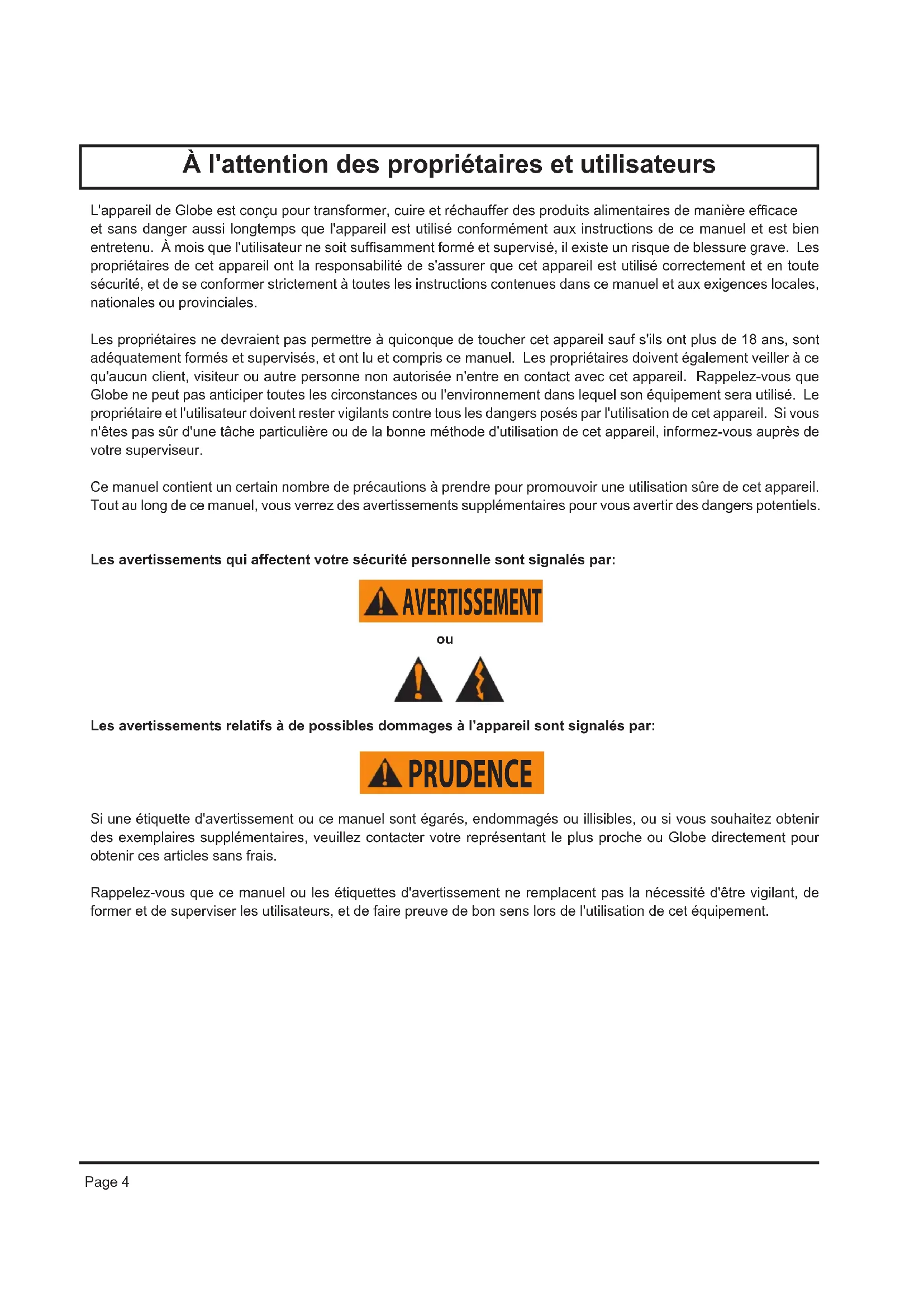 POUR COMPLÉTER ET SOUMETTRE VOTRE GARANTIE. www.globefoodequip.com/support/warranty-registration-form VR1REV3_2014Page 4 L'appareil de Globe est conçu pour transformer, cuire et réchauffer des produits alimentaires de manière efcace et sans danger aussi longtemps que l'appareil est utilisé conformément aux instructions de ce manuel et est bien entretenu. À mois que l'utilisateur ne soit sufsamment formé et supervisé, il existe un risque de blessure grave. Les propriétaires de cet appareil ont la responsabilité de s'assurer que cet appareil est utilisé correctement et en toute sécurité, et de se conformer strictement à toutes les instructions contenues dans ce manuel et aux exigences locales, nationales ou provinciales. Les propriétaires ne devraient pas permettre à quiconque de toucher cet appareil sauf s'ils ont plus de 18 ans, sont adéquatement formés et supervisés, et ont lu et compris ce manuel. Les propriétaires doivent également veiller à ce qu'aucun client, visiteur ou autre personne non autorisée n'entre en contact avec cet appareil. Rappelez-vous que Globe ne peut pas anticiper toutes les circonstances ou l'environnement dans lequel son équipement sera utilisé. Le propriétaire et l'utilisateur doivent rester vigilants contre tous les dangers posés par l'utilisation de cet appareil. Si vous n'êtes pas sûr d'une tâche particulière ou de la bonne méthode d'utilisation de cet appareil, informez-vous auprès de votre superviseur. Ce manuel contient un certain nombre de précautions à prendre pour promouvoir une utilisation sûre de cet appareil. Tout au long de ce manuel, vous verrez des avertissements supplémentaires pour vous avertir des dangers potentiels. Les avertissements qui affectent votre sécurité personnelle sont signalés par: Les avertissements relatifs à de possibles dommages à l'appareil sont signalés par: Si une étiquette d'avertissement ou ce manuel sont égarés, endommagés ou illisibles, ou si vous souhaitez obtenir des exemplaires supplémentaires, veuillez contacter votre représentant le plus proche ou Globe directement pour obtenir ces articles sans frais. Rappelez-vous que ce manuel ou les étiquettes d'avertissement ne remplacent pas la nécessité d'être vigilant, de former et de superviser les utilisateurs, et de faire preuve de bon sens lors de l'utilisation de cet équipement. À l'attention des propriétaires et utilisateurs AVERTISSEMENT PRUDENCE ouPage 5 Installation DÉBALLAGE Déballez le réchaud à induction immédiatement après sa réception. Si l'appareil est endommagé, conservez l'emballage et contactez le transporteur dans un délai de quinze (15) jours de la date de livraison. Contactez immédiatement Globe ou votre revendeur local. Vous n'avez aucun recours pour des dégâts après quinze (15) jours.POUR ÉVITER LES BLESSURES GRAVES: