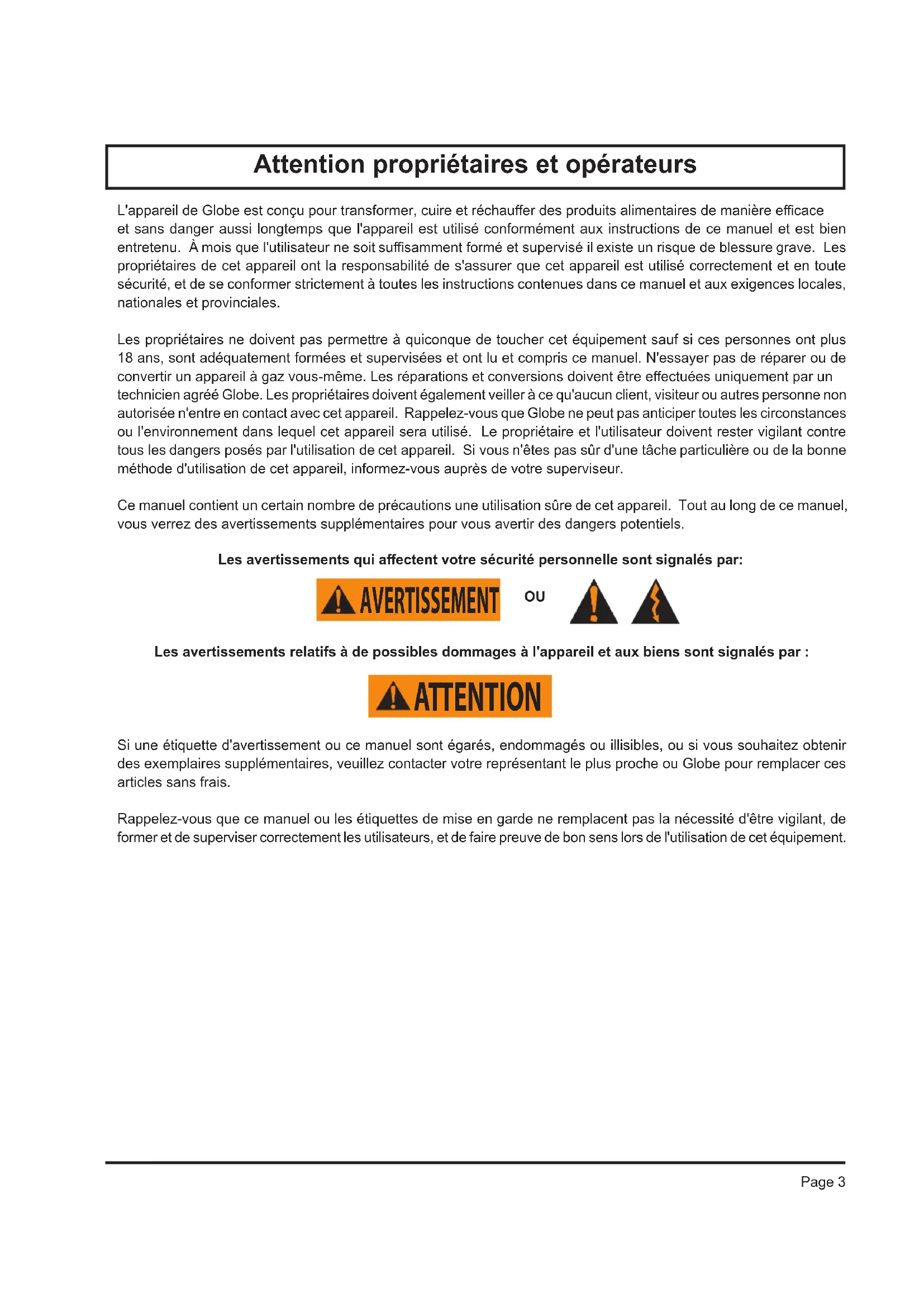 980196 Ver. 1 Rev. 5_2019 IndexPage 3 L'appareil de Globe est conçu pour transformer, cuire et réchauer des produits alimentaires de manière ecace et sans danger aussi longtemps que l'appareil est utilisé conformément aux instructions de ce manuel et est bien entretenu. À mois que l'utilisateur ne soit susamment formé et supervisé il existe un risque de blessure grave. Les propriétaires de cet appareil ont la responsabilité de s'assurer que cet appareil est utilisé correctement et en toute sécurité, et de se conformer strictement à toutes les instructions contenues dans ce manuel et aux exigences locales, nationales et provinciales. Les propriétaires ne doivent pas permettre à quiconque de toucher cet équipement sauf si ces personnes ont plus 18 ans, sont adéquatement formées et supervisées et ont lu et compris ce manuel. N'essayer pas de réparer ou de convertir un appareil à gaz vous-même. Les réparations et conversions doivent être eectuées uniquement par un technicien agréé Globe. Les propriétaires doivent également veiller à ce qu'aucun client, visiteur ou autres personne non autorisée n'entre en contact avec cet appareil. Rappelez-vous que Globe ne peut pas anticiper toutes les circonstances ou l'environnement dans lequel cet appareil sera utilisé. Le propriétaire et l'utilisateur doivent rester vigilant contre tous les dangers posés par l'utilisation de cet appareil. Si vous n'êtes pas sûr d'une tâche particulière ou de la bonne méthode d'utilisation de cet appareil, informez-vous auprès de votre superviseur. Ce manuel contient un certain nombre de précautions une utilisation sûre de cet appareil. Tout au long de ce manuel, vous verrez des avertissements supplémentaires pour vous avertir des dangers potentiels. Les avertissements qui aectent votre sécurité personnelle sont signalés par: