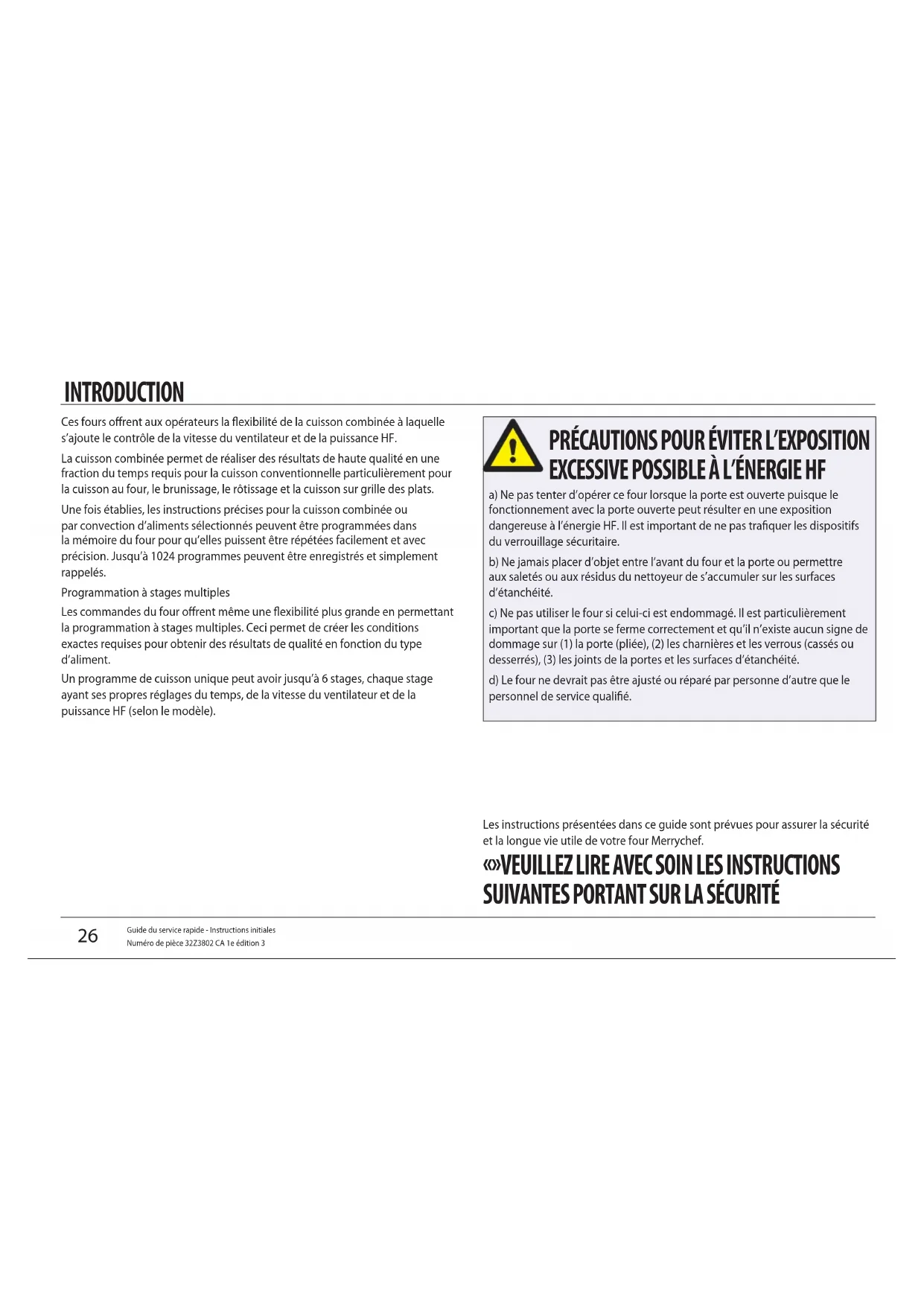 Les instructions présentées dans ce guide sont prévues pour assurer la sécurité et la longue vie utile de votre four Merrychef.Guide du service rapide - Instructions initialesNuméro de pièce 32Z3802 CA 1e édition 3