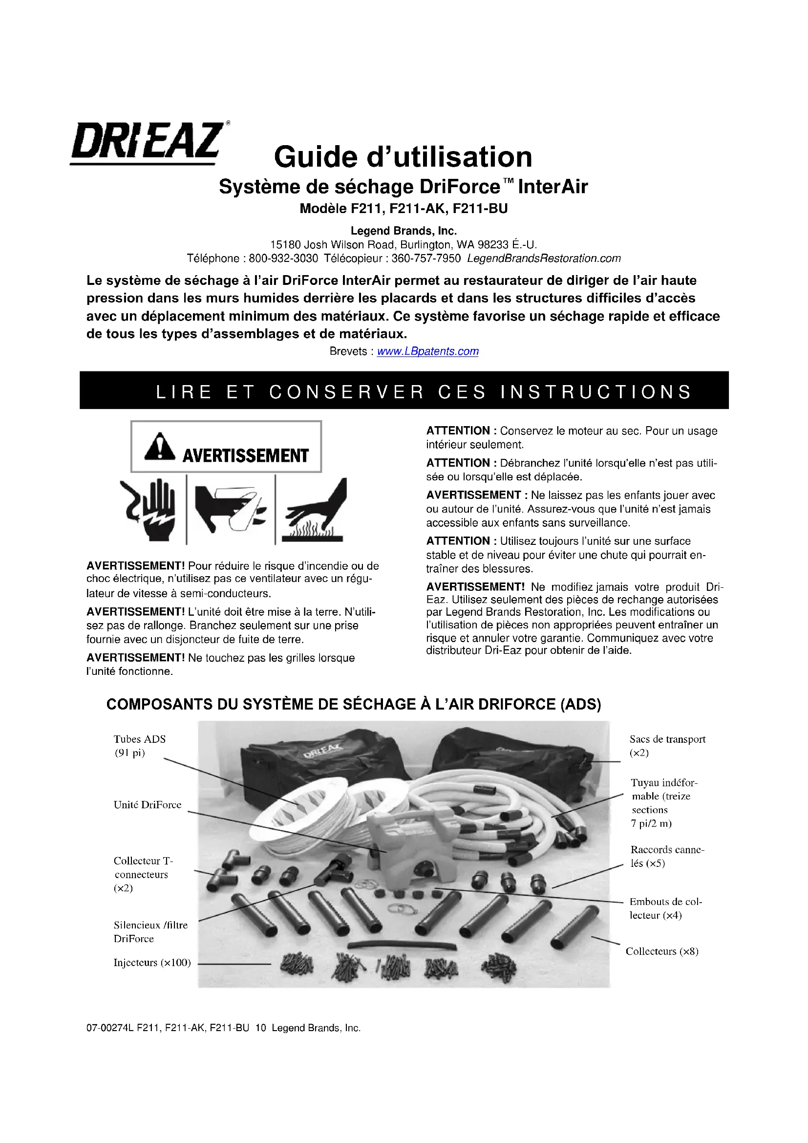 InterAir Modèle F211, F211-AK, F211-BU Legend Brands, Inc. 15180 Josh Wilson Road, Burlington, WA 98233 É.-U. Téléphone : 800-932-3030 Télécopieur : 360-757-7950 LegendBrandsRestoration.com Le système de séchage à l’air DriForce InterAir permet au restaurateur de diriger de l’air haute pression dans les murs humides derrière les placards et dans les structures difficiles d’accès avec un déplacement minimum des matériaux. Ce système favorise un séchage rapide et efficace de tous les types d’assemblages et de matériaux. Brevets : www.LBpatents.com L I R E E T C O N S E R V E R C E S I N S T R U C T I O N S