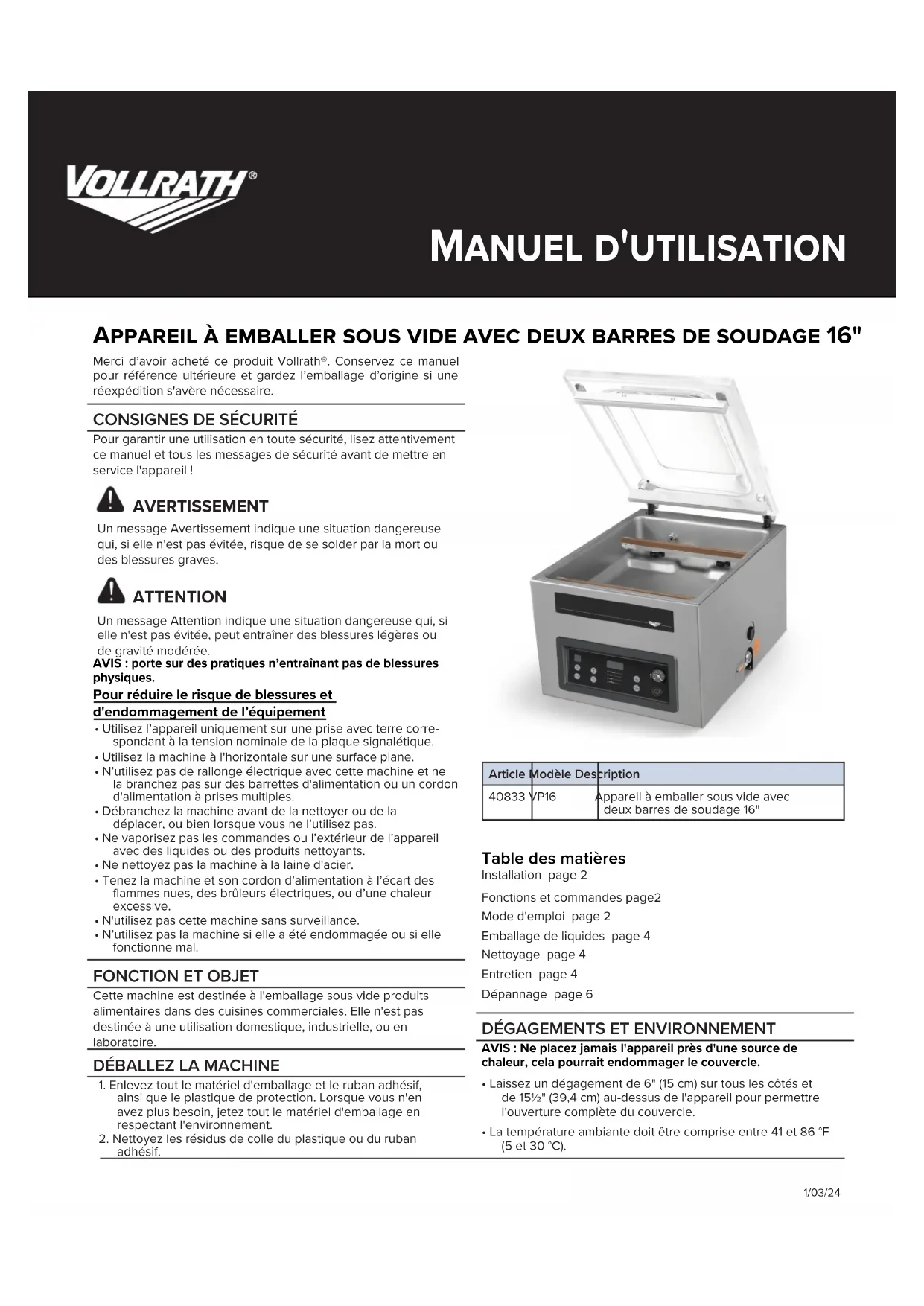 VP16 - Appareils à emballage sous vide Vollrath - Notice d'utilisation et mode d'emploi gratuit
