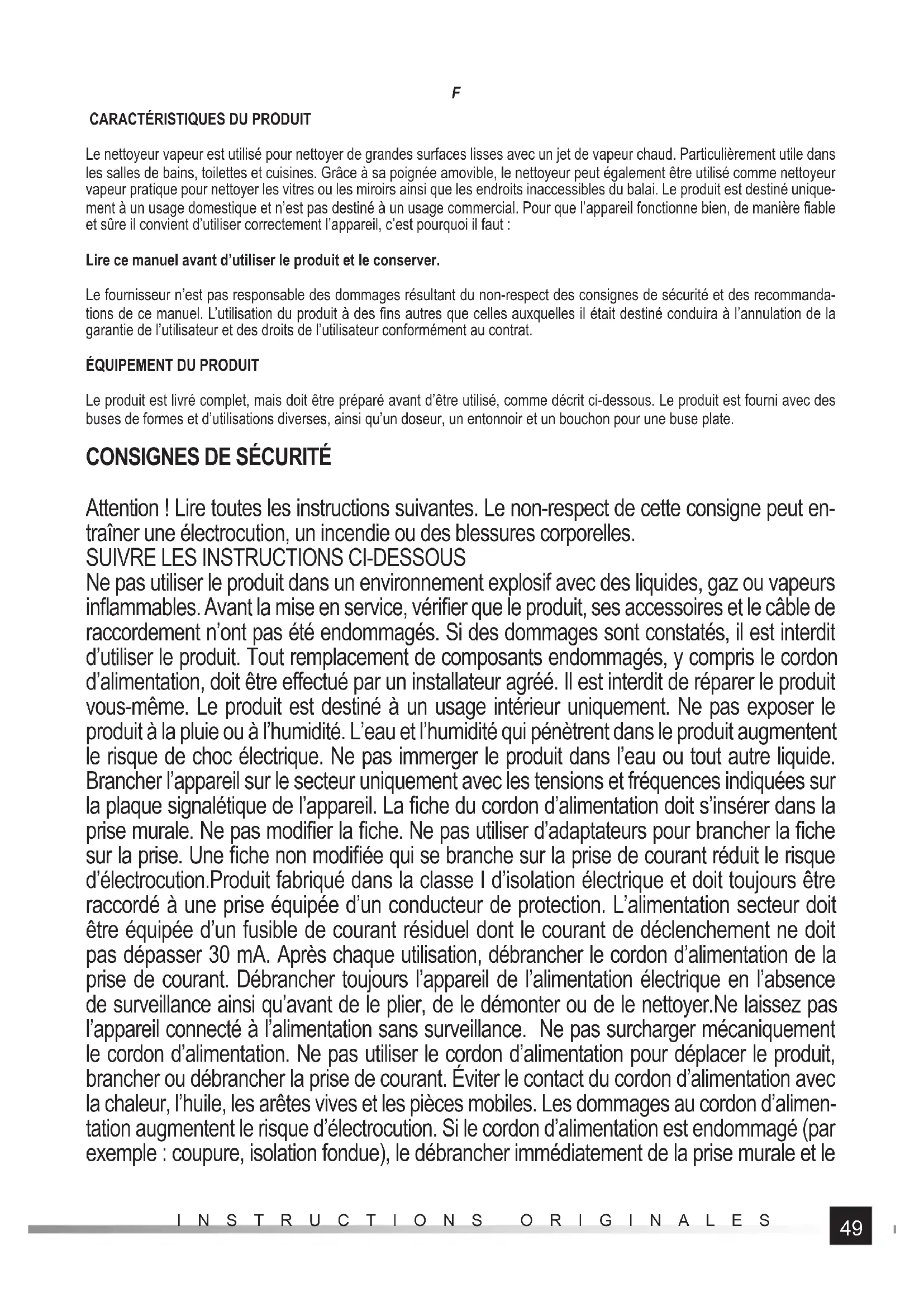 renvoyer à un centre de service autorisé. Il est interdit d’utiliser l’appareil avec un cordon d’ali- mentation endommagé. Il est interdit de réparer le cordon d’alimentation, le cordon doit être remplacé par un nouveau cordon dans un centre de service autorisé. Débrancher le cordon d’alimentation de la prise de courant avant d’installer, de retirer ou de régler les accessoires du produit.S’assurer que l’accessoire sélectionné est correctement installé avant de mettre en marche le produit.Ne pas trop remplir le produit. La température du boîtier ne doit pas dépasser 60 °C. La surcharge mécanique du produit entraînera une usure plus rapide et peut l’endommager et augmenter le risque de choc électrique. Le produit doit être maintenu sous surveillance pendant toute la durée de son utilisation. Ce produit n’est pas destiné aux enfants. Conserver le produit et son câble hors de portée des enfants. Il est important de s’assurer que les enfants ne traitent pas le produit comme un jouet. Les enfants non accom- pagnés ne pourront pas eff ectuer le nettoyage et l’entretien du produit. Gardez l’appareil hors de portée des enfants s’il est sous tension ou en train de refroidir. Le produit n’est pas destiné à être utilisé par des personnes ayant une capacité physique, sensorielle et relation- nelle réduite, ou qui ne sont pas familière avec le produit, à moins qu’une supervision ou des instructions ne soient données pour s’assurer que le produit est utilisé de manière sûre afi n que les dangers possibles soient clairement compris. Le réservoir d’eau ne doit pas rester ouvert pendant l’utilisation de l’appareil. N’utilisez pas l’appareil s’il est tombé, s’il présente des signes visibles de dommages ou s’il fuit. Ne jamais diriger le jet de vapeur vers soi, vers d’autres personnes ou des animaux. Le contact avec de la vapeur chaude peut causer de graves brûlures. Ne jamais remplir le produit avec une substance autre que de l’eau propre et froide. En particulier, n’utilisez pas de substances infl ammables telles que les alcools, les solvants. Ne pas ajouter ou ajouter à l’eau d’autres substances, par exemple des détergents.
