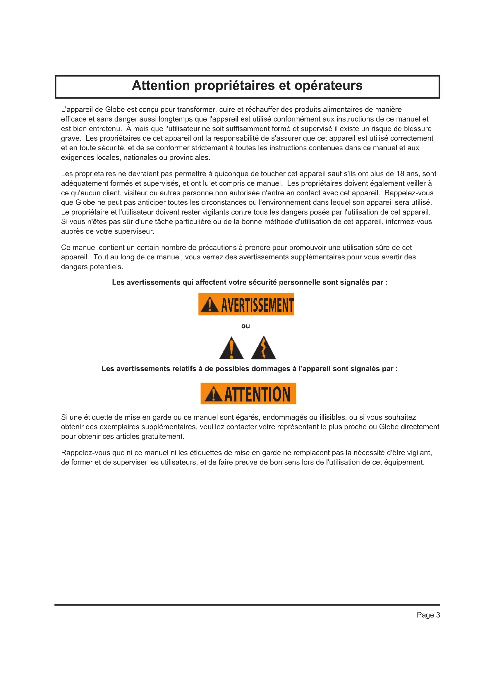 COURRIEL: info@globefoodequip.com SITE WEB : www.globefoodequip.com © Globe Food Equipment Company, 2017 980190 07062017 Original 3-2011 / Ver. 1 Rev 4_2017 Table des matièresPage 3 L'appareil de Globe est conçu pour transformer, cuire et réchauffer des produits alimentaires de manière efcace et sans danger aussi longtemps que l'appareil est utilisé conformément aux instructions de ce manuel et est bien entretenu. À mois que l'utilisateur ne soit sufsamment formé et supervisé il existe un risque de blessure grave. Les propriétaires de cet appareil ont la responsabilité de s'assurer que cet appareil est utilisé correctement et en toute sécurité, et de se conformer strictement à toutes les instructions contenues dans ce manuel et aux exigences locales, nationales ou provinciales. Les propriétaires ne devraient pas permettre à quiconque de toucher cet appareil sauf s'ils ont plus de 18 ans, sont adéquatement formés et supervisés, et ont lu et compris ce manuel. Les propriétaires doivent également veiller à ce qu'aucun client, visiteur ou autres personne non autorisée n'entre en contact avec cet appareil. Rappelez-vous que Globe ne peut pas anticiper toutes les circonstances ou l'environnement dans lequel son appareil sera utilisé. Le propriétaire et l'utilisateur doivent rester vigilants contre tous les dangers posés par l'utilisation de cet appareil. Si vous n'êtes pas sûr d'une tâche particulière ou de la bonne méthode d'utilisation de cet appareil, informez-vous auprès de votre superviseur. Ce manuel contient un certain nombre de précautions à prendre pour promouvoir une utilisation sûre de cet appareil. Tout au long de ce manuel, vous verrez des avertissements supplémentaires pour vous avertir des dangers potentiels. Les avertissements qui affectent votre sécurité personnelle sont signalés par : Les avertissements relatifs à de possibles dommages à l'appareil sont signalés par : Si une étiquette de mise en garde ou ce manuel sont égarés, endommagés ou illisibles, ou si vous souhaitez obtenir des exemplaires supplémentaires, veuillez contacter votre représentant le plus proche ou Globe directement pour obtenir ces articles gratuitement. Rappelez-vous que ni ce manuel ni les étiquettes de mise en garde ne remplacent pas la nécessité d'être vigilant, de former et de superviser les utilisateurs, et de faire preuve de bon sens lors de l'utilisation de cet équipement. Attention propriétaires et opérateurs AVERTISSEMENT AT TENTION ouPage 4 Composants principaux du chauffe soupe Base ronde robuste Bouton de réglage de la température Voyant d'alimentation électrique Corps revêtu à la poudre Poignée du couvercle Charnière Couvercle Récipient de chauffage intérieurPage 5 Installation DÉBALLAGE Déballez le chauffe soupe immédiatement après sa réception. Si l'appareil est endommagé, conservez l'embal- lage et contactez le transporteur dans un délai de quinze (15) jours de la date de livraison. Contactez immédiate- ment Globe ou votre revendeur local. Vous n'avez aucun recours pour des dégâts après quinze (15) jours. POUR ÉVITER LES BLESSURES GRAVES :