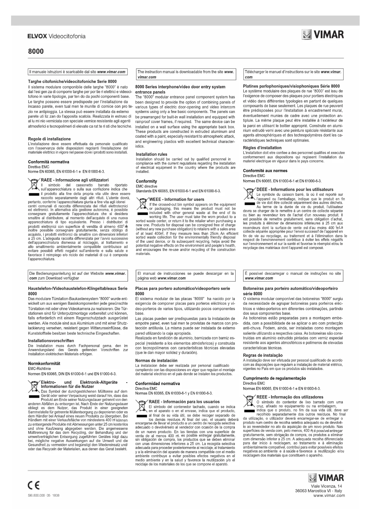 truídas em alumínio extrudido pintadas com verniz especial resistente aos agentes atmosféricos e polímeros de elevadas características técnicas. Platines parlophoniques/visiophoniques Série 8000 Le système modulaire des plaques de rue “8000” est issu de l’exigence de composer des plaques pour portiers électriques et vidéo dans différentes typologies en partant de quelques composants de base seulement. Les plaques de rue peuvent être prédisposées pour l’installation à encastrement mural, éventuellement munies de cadre avec une protection an- tipluie. La même plaque peut être installée à l’extérieur de la paroi en utilisant le boîtier approprié. Construite en alumi- nium extrudé verni avec une peinture spéciale résistante aux agents atmosphériques et des technopolymères dont les ca- ractéristiques techniques sont optimales. Haustelefon-/Videohaustelefon-Klingeltableaus Serie