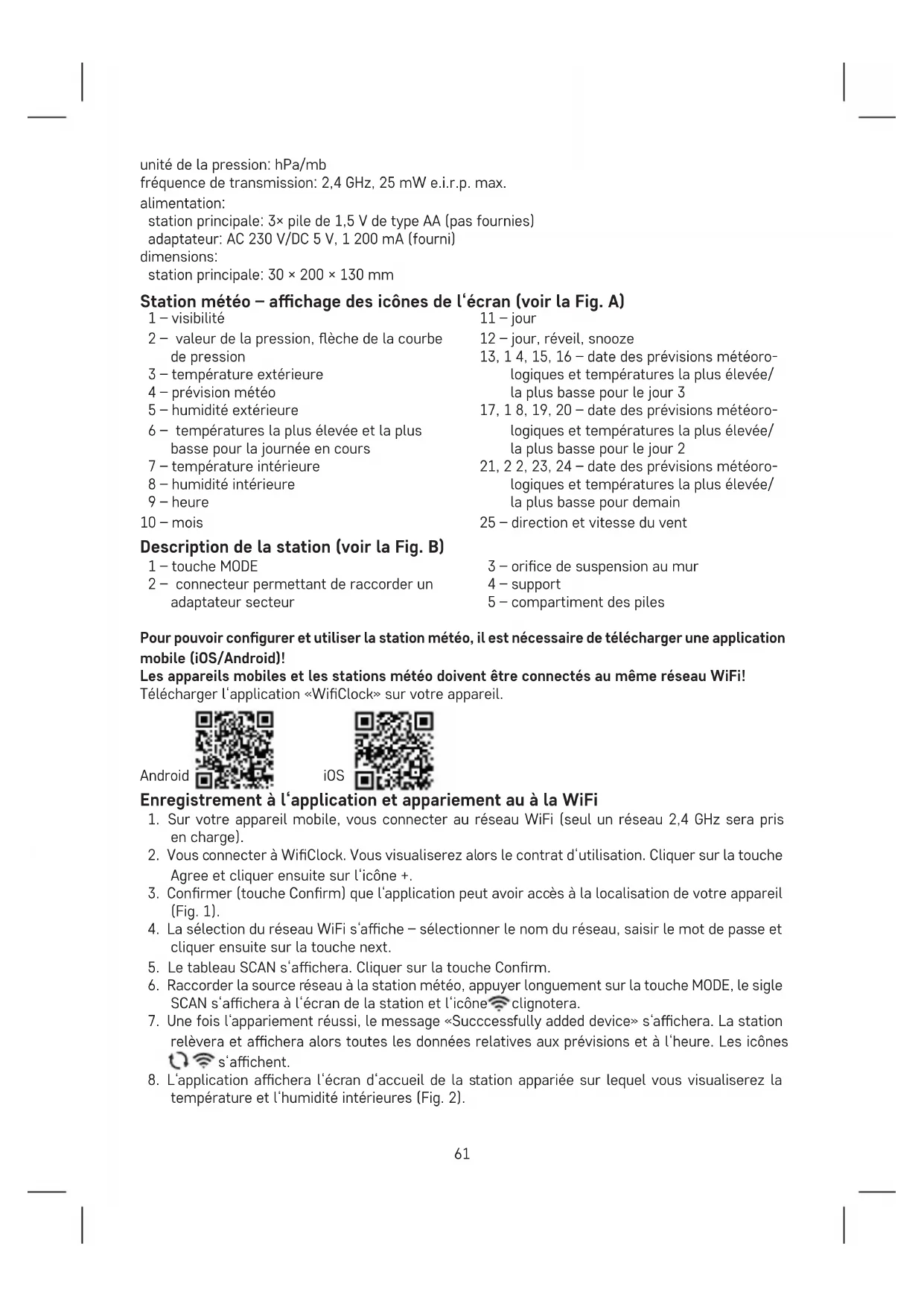 - Това устройство не е предназначено за използване от лица (включително деца), чиито физически, сетивни или умствени способности, както и липсата на опит или познания, биха им попречили на безопасното му използване. Такива лица трябва да бъдат инструктирани как да използват устройството и да са под надзора на лице, отговарящо за тяхната безопасност. C настоящото EMOS spol. s r. o. декларира, че този тип радиосъоръжение E0389 е в съответствие с Директива 2014/53/ЕС. Цялостният текст на ЕС декларацията за съответствие може да се намери на следния интернет адрес: http://www.emos.eu/download. FR | Station météo sans l avec WiFi Avant de commencer à utiliser cet appareil, lire attentivement la notice utilisateur. Spécications horloge pilotée par signal WiFi format de l‘heure: 12/24 h température intérieure: -10 °C à +50 °C, résolution de 0,1 °C température extérieure: sur la base des données provenant du serveur, résolution de 1 °C précision de la mesure de la température: ±1 °C pour la plage de 0 à +50 °C, ±1,5 °C pour les autres plages humidité intérieure et extérieure: 10 à 99 % de HR, résolution de 1 % précision de la mesure de l‘humidité: ±5 % pour la plage de 30 à 80 %, ±8 % pour la plage de 20 à 29 % et de 81 à 95 %, ±12 % pour la plage de 1 à 19 % et de 96 à 99 % cycle de détection de la température et de l‘humidité: toutes les 60 secondes plage de mesure de la pression bar.: sur la base des données du serveur61 unité de la pression: hPa/mb fréquence de transmission: 2,4 GHz, 25 mW e.i.r.p. max. alimentation: station principale: 3× pile de 1,5 V de type AA (pas fournies) adaptateur: AC 230 V/DC 5 V, 1 200 mA (fourni) dimensions: station principale: 30 × 200 × 130 mm Station météo – achage des icônes de l‘écran (voir la Fig. A) 1 – visibilité 2 – valeur de la pression, èche de la courbe de pression 3 – température extérieure 4 – prévision météo 5 – humidité extérieure 6 – températures la plus élevée et la plus basse pour la journée en cours 7 – température intérieure 8 – humidité intérieure 9 – heure 10 – mois 11 – jour 12 – jour, réveil, snooze 13, 1 4, 15, 16 – date des prévisions météoro- logiques et températures la plus élevée/ la plus basse pour le jour 3 17, 1 8, 19, 20 – date des prévisions météoro- logiques et températures la plus élevée/ la plus basse pour le jour 2 21, 2 2, 23, 24 – date des prévisions météoro- logiques et températures la plus élevée/ la plus basse pour demain 25 – direction et vitesse du vent Description de la station (voir la Fig. B) 1 – touche MODE 2 – connecteur permettant de raccorder un adaptateur secteur 3 – orice de suspension au mur 4 – support 5 – compartiment des piles Pour pouvoir congurer et utiliser la station météo, il est nécessaire de télécharger une application mobile (iOS/Android)! Les appareils mobiles et les stations météo doivent être connectés au même réseau WiFi! Télécharger l‘application «WiClock» sur votre appareil. Android iOS Enregistrement à l‘application et appariement au à la WiFi