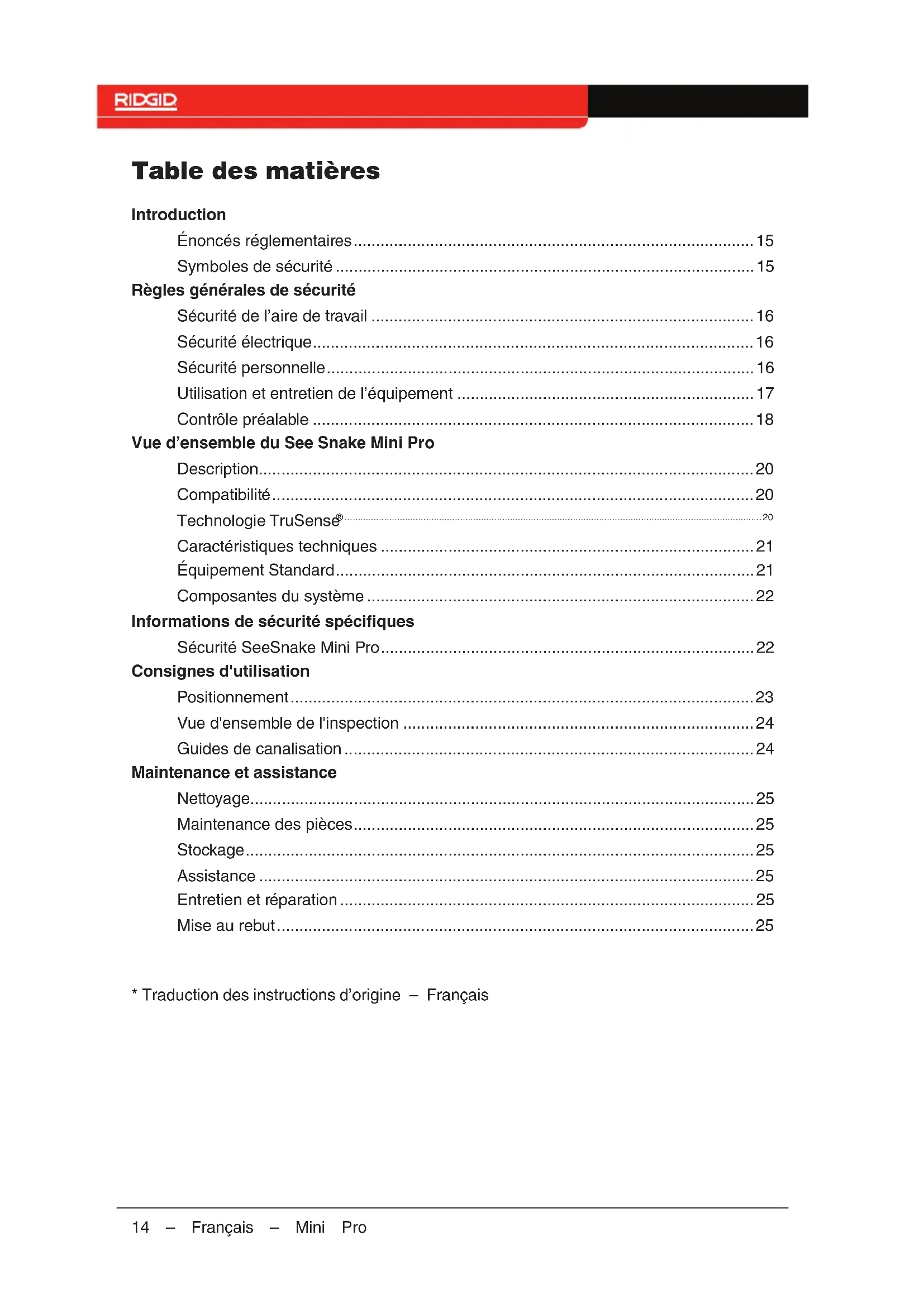 Disposal Parts of your system contain valuable mate- rials that can be recycled. There are compa- nies that specialize in recycling that may be found locally. Dispose of the components in compliance with all applicable regulations. Contact your local waste management au- thority for more information. EC Countries: Do not dispose of electrical equipment with household waste! According to the Europe- an Guideline 2012/19/EU for Waste Electrical and Electronic Equipment and its implemen- tation into national legislation, electrical equipment that is no longer usable must be collect- ed separately and disposed of in an environmentally correct manner. Battery Disposal EC Countries: Defective or used batteries must be recycled according to the guideline 2006/66/EEC.Pour des informations supplémen- taires sur See Snake Mini, visitez support.seesnake.com/fr/mini- pro ou scannez ce code QR. Manuel de l’opérateur AVERTISSEMENT ! Lire soigneusement ce Ma- nuel de l'opérateur avant d'utiliser cet appareil. Un manque de compréhension et un manque de respect du contenu de ce manuel peuvent causer un choc électrique, un incendie et/ou des blessures graves.14 – Français – Mini Pro Table des matières Introduction Énoncés réglementaires 15 Symboles de sécurité 15 Règles générales de sécurité Sécurité de l’aire de travail 16 Sécurité électrique 16 Sécurité personnelle 16 Utilisation et entretien de l’équipement 17 Contrôle préalable 18 Vue d’ensemble du See Snake Mini Pro Description 20 Compatibilité 20 Technologie TruSense ® 20 Caractéristiques techniques 21 Équipement Standard 21 Composantes du système 22 Informations de sécurité spécifiques Sécurité See Snake Mini Pro 22 Consignes d'utilisation Positionnement 23 Vue d'ensemble de l'inspection 24 Guides de canalisation 24 Maintenance et assistance Nettoyage 25 Maintenance des pièces 25 Stockage 25 Assistance 25 Entretien et réparation 25 Mise au rebut 25