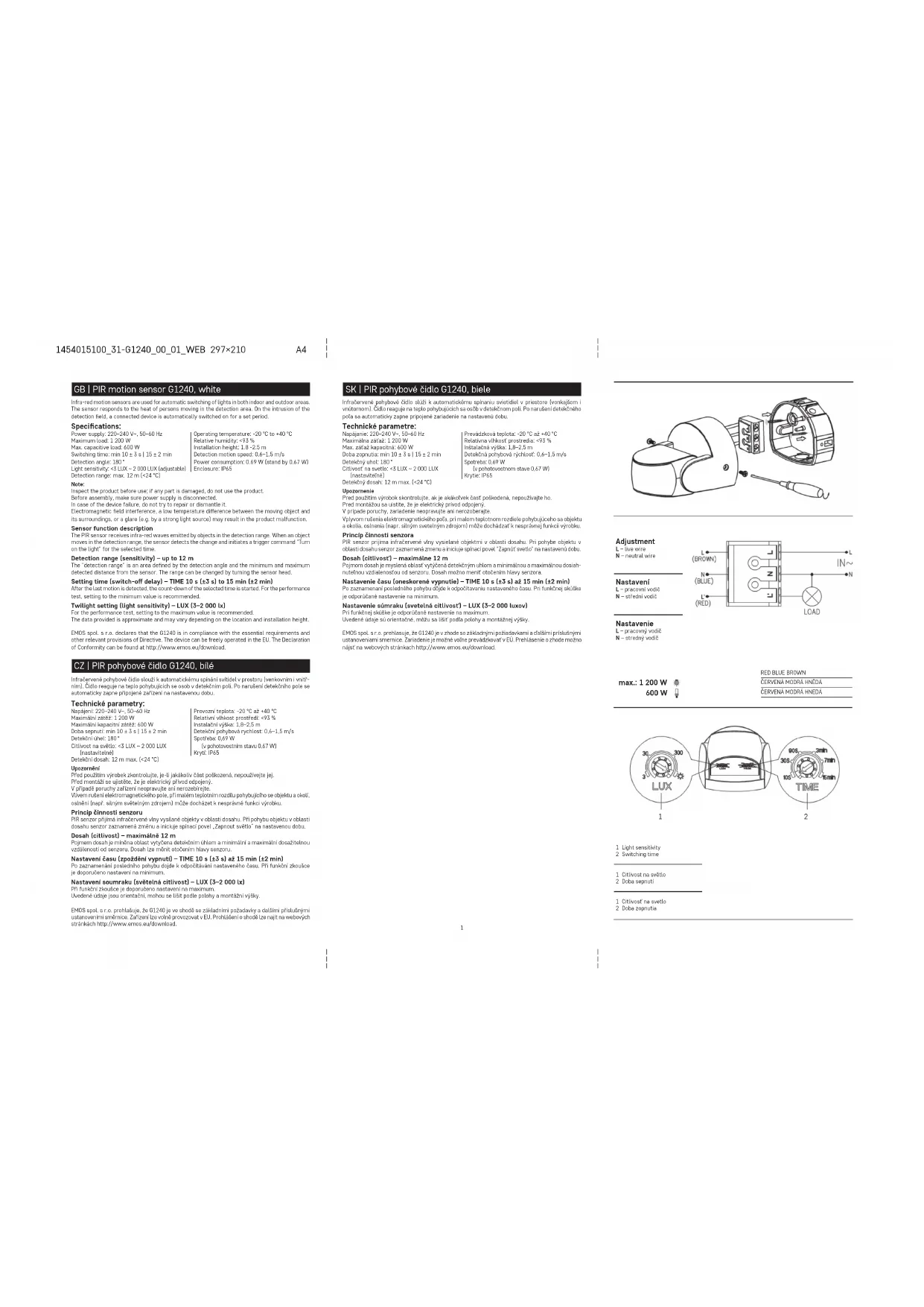 FR|BE | Détecteur de mouvement PIR G1240, blanc Ce détecteur de mouvement à infrarouges est utilisé pour allumer automatiquement des lampes (aussi bien à l'extérieur qu'à l'intérieur). Le capteur réagit à la chaleur dégagée par les personnes qui se déplacent dans le champ de détection. En cas de violation du champ de détection, le dispositif raccordé s'active automatiquement et reste ensuite activé durant la période ayant été paramétrée. Paramètres techniques : Alimentation : 220–240 V~, 50–60 Hz Charge maximale : 1 200 W Charge capacitaire maximale : 600 W Durée d'enclenchement : min 10 ± 3 s | 15 ± 2 min Angle de détection : 180° Sensibilité à la lumière : < 3 LUX ~ 2 000 LUX (peut être modié) Portée de la détection : 12 m max. (< 24 °C) Température d'exploitation : -20 °C à +40 °C Humidité relative ambiante : < 93 % Hauteur d'installation : 1,8–2,5 m Vitesse de détection : 0,6–1,5 m/s Consommation : 0,69 W (en mode de veille 0,67 W) Indice de protection : IP65 Avertissement Contrôler l'appareil avant de l'utiliser. Si une de ses parties devait être endommagée, il conviendra de ne plus utiliser le dispositif. Avant de procéder au montage, vérier que l'alimentation électrique a été coupée. Si le dispositif est en défaut, ne pas essayer de le réparer ni de le démonter. Des perturbations du champ électromagnétique, une faible diérence de température entre l'atmosphère et l'objet en mouvement, un éblouissement (par exemple suite à la présence d'une puissance source de lumière), tout cela peut faire que le produit ne fonctionne pas correctement. Principe de fonctionnement du capteur Le capteur PIR réceptionne les ondes infrarouges émises par les objets qui se trouvent dans sa zone de portée. Lorsqu'un objet se déplace dans sa zone de portée, le capteur enregistre ce changement et initialise l'ordre "Allumer la lumière" durant la période ayant été préalablement paramétrée. Portée (sensibilité) – au maximum 12 m Par le terme "Portée", nous entendons une zone délimitée par l'angle de détection et la distance minimale et maximale pouvant être atteinte par le capteur. Il est possible de modier la portée en faisant pivoter la tête du capteur. Réglage du temps (temporisation de l'extinction) – TIME 10 s (± 3 s) à 15 min (± 2 min) Le décompte du temps ayant été paramétré commencera après enregistrement du dernier mou- vement. Lors de l'essai fonctionnel, il est recommandé de régler le temps à sa valeur minimale. Réglage du crépuscule (sensibilité à la lumière) – LUX (3–2 000 lx) Lors de l'essai fonctionnel, il est recommandé de régler ce paramètre à sa valeur maximale. Ces informations ne sont fournies qu'à titre indicatif, elles pourront varier en fonction de la position et de la hauteur de montage. La société EMOS spol. s r.o. déclare et atteste que le dispositif G1240 est conforme aux exigences fondamentales et aux autres dispositions pertinentes de la directive. Cet équipement/ce dispositif peut être librement utilisé sur le territoire de l'UE. La déclaration de conformité est disponible sur le site http://www.emos.eu/download.6