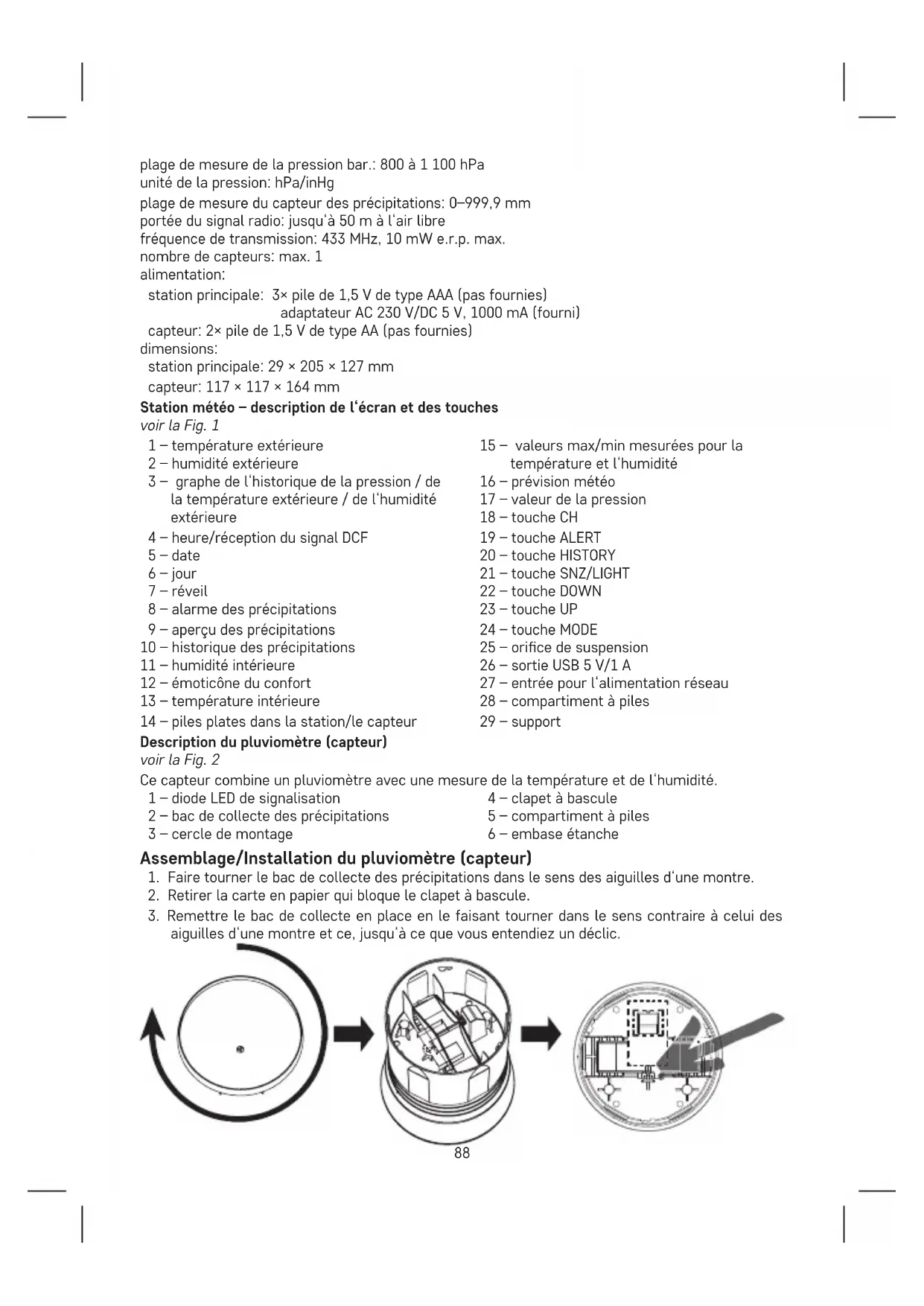 station météo ou le capteur. N‘utiliser que des piles alcalines de 1,5V qui sont de même type et ne jamais utiliser de piles rechargeables de 1,2V. Une tension trop basse pourrait provoquer un dysfonctionnement des deux unités.