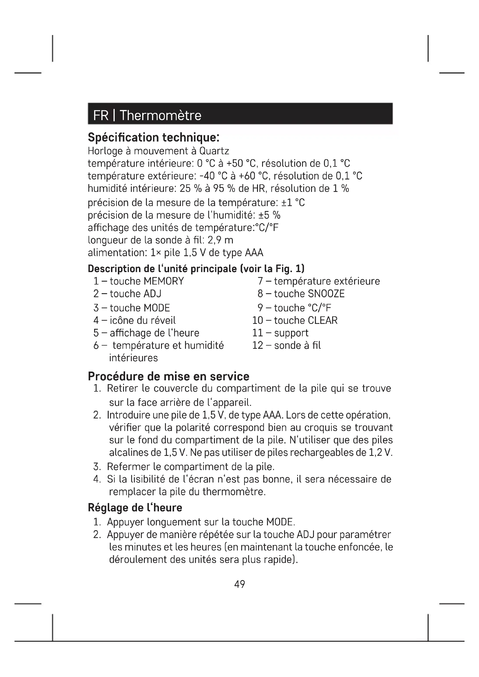 remplacer la pile du thermomètre. Réglage de l‘heure