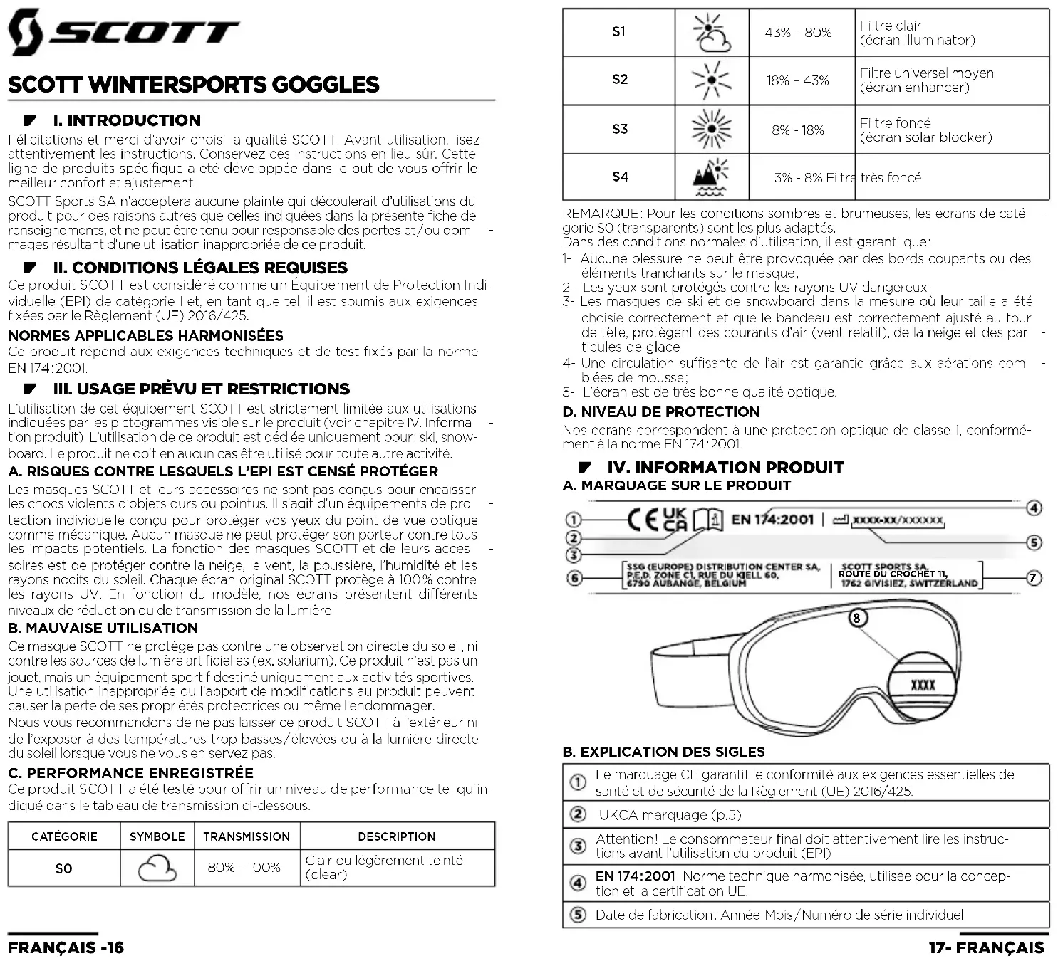 - II. CONDITIONS LÉGALES REQUISES Ce produit SCOTT est considéré comme un Équipement de Protection Indi- viduelle (EPI) de catégorie I et, en tant que tel, il est soumis aux exigences fixées par le Règlement (UE) 2016/425.