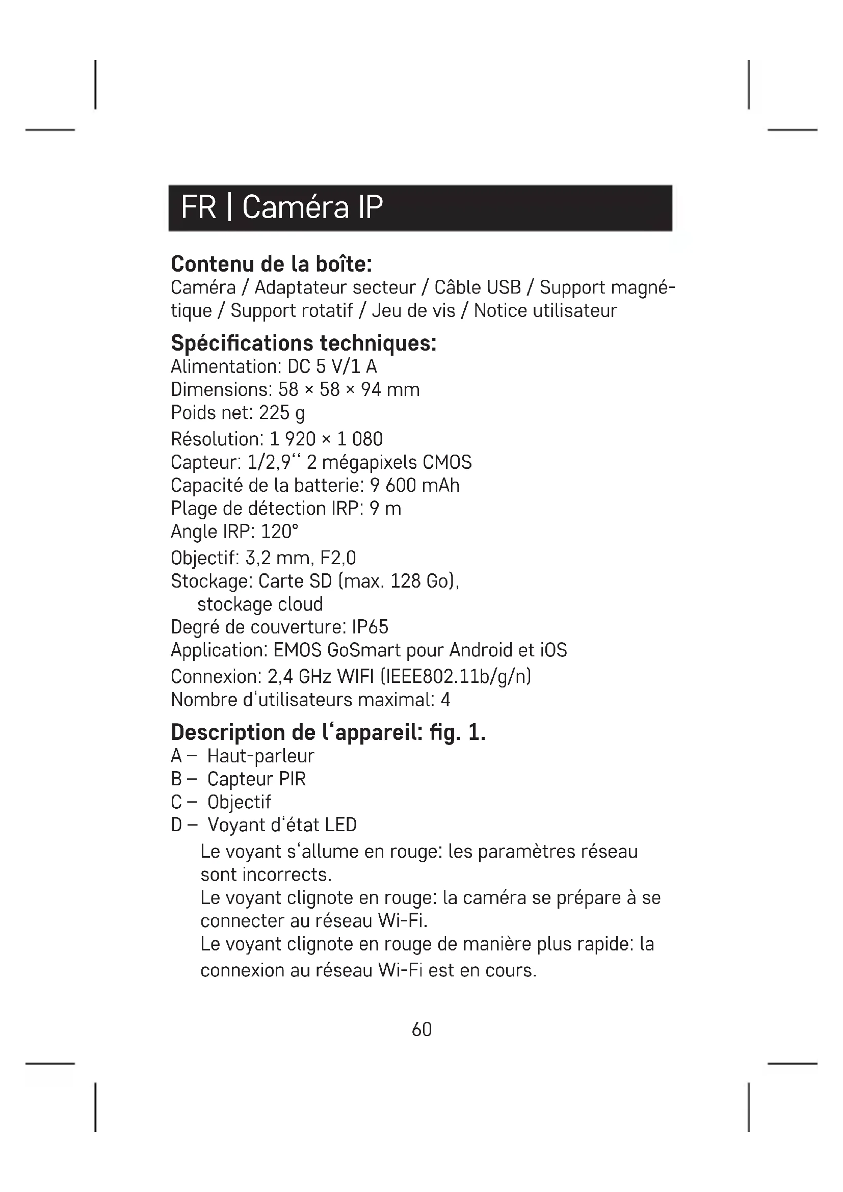 avec une vis. Installation de l‘application EMOS GoSmart: g. 3 L‘application est disponible pour Android et iOS via Google Play et l‘App Store. Scannez le QR code correspondant pour télécharger l‘appli- cation. Conguration du routeur: g. 4 La caméra ne prend en charge que le Wi-Fi 2,4 GHz (ne prend pas en charge le Wi-Fi 5 GHz).62 Application mobile EMOS GoSmart: Fig. 5a Ouvrez l‘application EMOS GoSmart, acceptez la politique de condentialité et cliquez sur J‘accepte. Fig. 5b Sélectionnez l‘option d‘enregistrement. Fig. 5c Saisissez une adresse électronique valide et choisissez un mot de passe. Conrmez votre accord avec la politique de condentialité. Sélectionnez Enregistrer. Fig. 6a Sélectionnez l‘option Ajouter un appareil. Fig. 6b Sélectionnez la catégorie de produit donnée. Fig. 6c Sélectionnez le type de produit donné. Fig. 6d Branchez l‘appareil sur le secteur et allumez-le. Fig. 6e Assurez-vous que le voyant LED de l‘appareil clignote. Conrmez avec la touche Suivant. Fig. 6f Saisissez le nom du réseau Wi-Fi et le mot de passe. Conrmez avec la touche Suivant. Fig. 6g Un QR code apparaît sur l‘écran de votre appareil mobile. Placez le QR code devant l‘objectif de la caméra. Conrmez que vous avez entendu un bip indiquant que l‘appairage a fonctionné. Fig. 6h La recherche automatique de l‘appareil s‘eectue. Fig. 6i L‘appareil a été retrouvé.63 Conrmez avec la touche Terminer. Connectivité: Wi-Fi 2,4 GHz IEEE 802.11b/g/n Bande de fréquence: 2,400–2,4835 GHz Par la présente, EMOS spol. s r. o. déclare que l‘équipement radio de type H4053 est conforme à la directive 2014/53/UE. Le texte intégral de la déclaration de conformité de l‘UE est disponible à l‘adresse Internet suivante: http://www.emos. eu/download. Ne pas jeter avec les ordures ménagères. Utilisez des points de collecte spéciaux pour les déchets tries. Contactez les autorités locales pour obtenir des infor- mations sur les points de collecte. Si les appareils électroniques sont mis en décharge, des substances dangereuses peuvent atteindre les eaux souterraines et, par la suite, la chaîne alimentaire, où elles peuvent aecter la santé humaine. IT | IP telecamera Contenuto della confezione: Unità della telecamera / Adattatore di alimentazione / Cavo USB / Supporto magnetico / Supporto girevole / Set di viti / Manuale d’uso Speciche tecniche: Alimentazione: DC 5 V/1 A Dimensioni: 58 × 58 × 94 mm Peso netto: 225 g Denizione: 1 920 × 1 080 Sensore: 1/2,9‘‘ 2 Megapixel CMOS Capacità della batteria: 9 600 mAh Campo di rilevamento PIR: 9 m64 Angolo PIR: 120° Obiettivo: 3,2 mm, F2,0 Archivio: Scheda SD (Massimo 128 GB), Cloud storage Grado di protezione: IP65 APP: EMOS GoSmart for Android and iOS Connessione: 2,4 GHz WIFI (IEEE802.11b/g/n) Numero massimo di utenti: 4 Descrizione del dispositivo: Fig. 1 A – Riproduttore B – Sensore PIR C – Obiettivo D – Diodo LED di stato Diodo è di colore rosso: impostazione di rete non è corretta. Diodo lampeggia in rosso: la telecamera si sta preparando a connettersi alla rete Wi-Fi. Diodo lampeggia in rosso velocemente: la connessione alla rete Wi è in corso. Diodo è di colore blu: la telecamera funziona corretta- mente. E – Pulsante RESET Premere il pulsante RESET per 5 secondi per ripristinare il dispositivo alle impostazioni di fabbrica. F – Sensore di luminosità G – Ingresso Micro USB H – Indicatore di ricarica Diodo è di colore rosso: la batteria si sta caricando. Diodo è di colore blu: la ricarica è completata. I – Microfono J – Slot per scheda SD (massimo 128 GB)65 Installazione del supporto magnetico: Fig. 2a