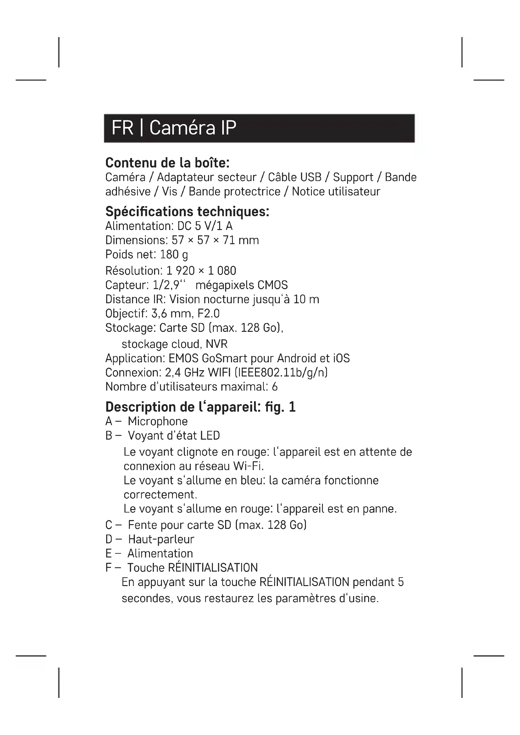 Installation de la caméra sur une surface inégale: g. 3 Appliquez du ruban adhésif sur le bas du support. Placez la caméra avec le support à l‘emplacement désigné. Installation du ruban de protection: g. 4 Si nécessaire, un ruban de protection peut être xé sur le bord de la caméra pour éviter d‘éventuels dommages. Installation de l‘application EMOS GoSmart: g. 5 L‘application est disponible pour Android et iOS via Google Play et l‘App Store. Scannez le QR code correspondant pour télécharger l‘appli- cation. Conguration du routeur: g. 6 La caméra ne prend en charge que le Wi-Fi 2,4 GHz (ne prend pas en charge le Wi-Fi 5 GHz). Application mobile EMOS GoSmart: Fig. 5a Ouvrez l‘application EMOS GoSmart, acceptez la politique de condentialité et cliquez sur J‘accepte. Fig. 5b Sélectionnez l‘option d‘enregistrement. Fig. 5c Saisissez une adresse électronique valide et choisissez un mot de passe.Conrmez votre accord avec la politique de condentialité. Sélectionnez Enregistrer. Fig. 6a Sélectionnez l‘option Ajouter un appareil. Fig. 6b Sélectionnez la catégorie de produit donnée. Fig. 6c Sélectionnez le type de produit donné. Fig. 6d Branchez l‘appareil sur le secteur et allumez-le. Fig. 6e Assurez-vous que le voyant LED de l‘appareil clignote. Conrmez avec la touche Suivant. Fig. 6f Saisissez le nom du réseau Wi-Fi et le mot de passe. Conrmez avec la touche Suivant. Fig. 6g Un QR code apparaît sur l‘écran de votre appareil mobile. Placez le QR code devant l‘objectif de la caméra. Conrmez que vous avez entendu un bip indiquant que l‘appairage a fonctionné. Fig. 6h La recherche automatique de l‘appareil s‘eectue. Fig. 6i L‘appareil a été retrouvé. Conrmez avec la touche Terminer. Connectivité: Wi-Fi 2,4 GHz IEEE 802.11b/g/n Bande de fréquence: 2,400–2,4835 GHz Par la présente, EMOS spol. s r. o. déclare que l‘équipement radio de type H4051 est conforme à la directive 2014/53/UE. Le texte intégral de la déclaration de conformité de l‘UE est disponible à l‘adresse Internet suivante: http://www.emos. eu/download.Ne pas jeter avec les ordures ménagères. Utilisez des points de collecte spéciaux pour les déchets tries. Contactez les autorités locales pour obtenir des infor- mations sur les points de collecte. Si les appareils électroniques sont mis en décharge, des substances dangereuses peuvent atteindre les eaux souterraines et, par la suite, la chaîne alimentaire, où elles peuvent aecter la santé humaine. IT | IP telecamera Contenuto della confezione: Camera / Adattatore di alimentazione / Cavo USB / Supporto / Nastro adesivo / Viti / Nastro protettivo / Manuale d’uso Speciche tecniche: Alimentazione: DC 5 V/1 A Dimensioni: 57 × 57 × 71 mm Peso netto: 180 g Denizione: 1 920 × 1 080 Sensore: 1/2,9‘‘ 2 Megapixel CMOS Distanza IR: Visione notturna no a 10 m Obiettivo: 3,6 mm, F2,0 Archivio: Scheda SD (Massimo 128 GB), Cloud storage, NVR APP: EMOS GoSmart for Android and iOS Connessione: 2,4 GHz WIFI (IEEE802.11b/g/n) Numero massimo di utenti: 6 Descrizione del dispositivo: Fig. 1 A – Microfono B – Diodo LED di stato Diodo lampeggia in rosso: il dispositivo è in attesa di connettersi alla rete Wi-Fi. Diodo lampeggia in blu: la telecamera funzionacorrettamente. Diodo è di colore rosso: il dispositivo non funziona. C – Slot per scheda SD (massimo 128 GB) D – Riproduttore E – Alimentazione F – Pulsante RESET Premere il pulsante RESET per 5 secondi per ripristinare il dispositivo alle impostazioni di fabbrica. Premere il pulsante RESET per 1 secondo per attivare la modalità di impostazione manuale Wi-Fi. Installazione della telecamera sul sotto: Fig. 2a/2b