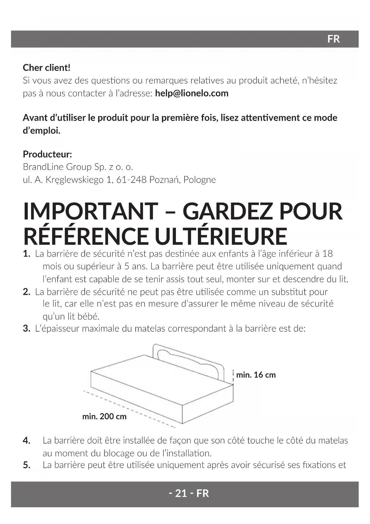 La barrière peut être ulisée uniquement après avoir sécurisé ses xaons et FR‑ 22 ‑FR après les avoir xés en toute sécurité tant au lit ou au matelas qu’à la barrière.