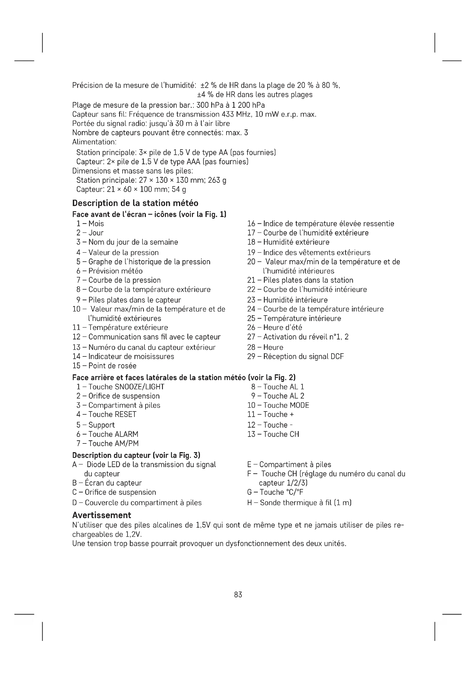 capteur sans l (2× 1,5 V de type AAA). Lors de l‘introduction des piles, veiller à bien vérier la polarité an de ne pas endommager la station météo ou le capteur.