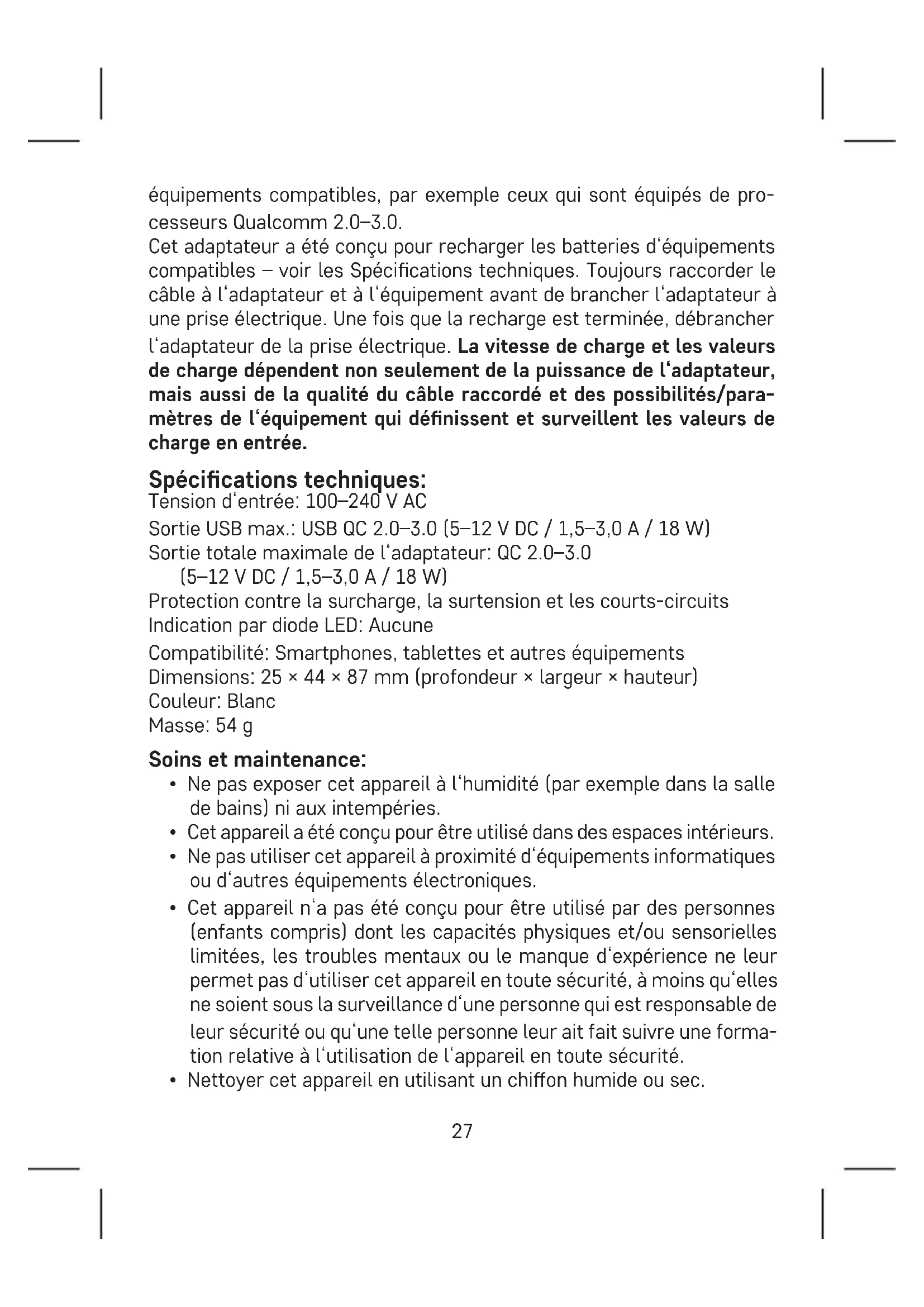 FR | Adaptateur réseau USB de type QUICK Notice utilisateur: Avant toute utilisation, lire attentivement la Notice utilisateur et respecter toutes les consignes qui y sont stipulées. Description et possibilités: Adaptateur chargeur de type QUICK QUICK = les paramètres de la sortie USB (V; A; W) se règlent en fonction des équipements qui y sont raccordés et ce, jusqu‘aux valeurs maximales de l‘adaptateur. L‘adaptateur permet également une recharge rapide = la recharge de vos équipements sera ainsi de 50 % plus rapide avec la même tension de sortie (3,6–12 V DC) – valable uniquement pour les27 équipements compatibles, par exemple ceux qui sont équipés de pro- cesseurs Qualcomm 2.0–3.0. Cet adaptateur a été conçu pour recharger les batteries d‘équipements compatibles – voir les Spécications techniques. Toujours raccorder le câble à l‘adaptateur et à l‘équipement avant de brancher l‘adaptateur à une prise électrique. Une fois que la recharge est terminée, débrancher l‘adaptateur de la prise électrique. La vitesse de charge et les valeurs de charge dépendent non seulement de la puissance de l‘adaptateur, mais aussi de la qualité du câble raccordé et des possibilités/para- mètres de l‘équipement qui dénissent et surveillent les valeurs de charge en entrée. Spécications techniques: Tension d‘entrée: 100–240 V AC Sortie USB max.: USB QC 2.0–3.0 (5–12 V DC / 1,5–3,0 A / 18 W) Sortie totale maximale de l‘adaptateur: QC 2.0–3.0 (5–12 V DC / 1,5–3,0 A / 18 W) Protection contre la surcharge, la surtension et les courts-circuits Indication par diode LED: Aucune Compatibilité: Smartphones, tablettes et autres équipements Dimensions: 25 × 44 × 87 mm (profondeur × largeur × hauteur) Couleur: Blanc Masse: 54 g Soins et maintenance: