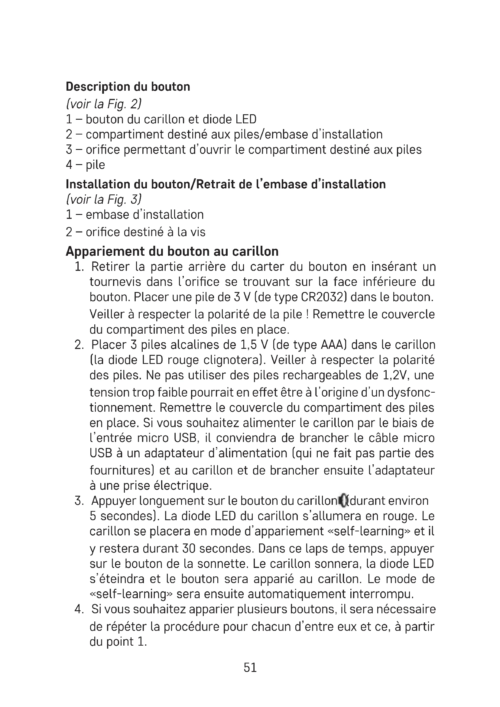 - Vérier de temps en temps que le bouton du carillon fonctionne correctement et remplacer les piles susamment à temps. N’utiliser que des piles alcalines de qualité et répondant aux paramètres prescrits.