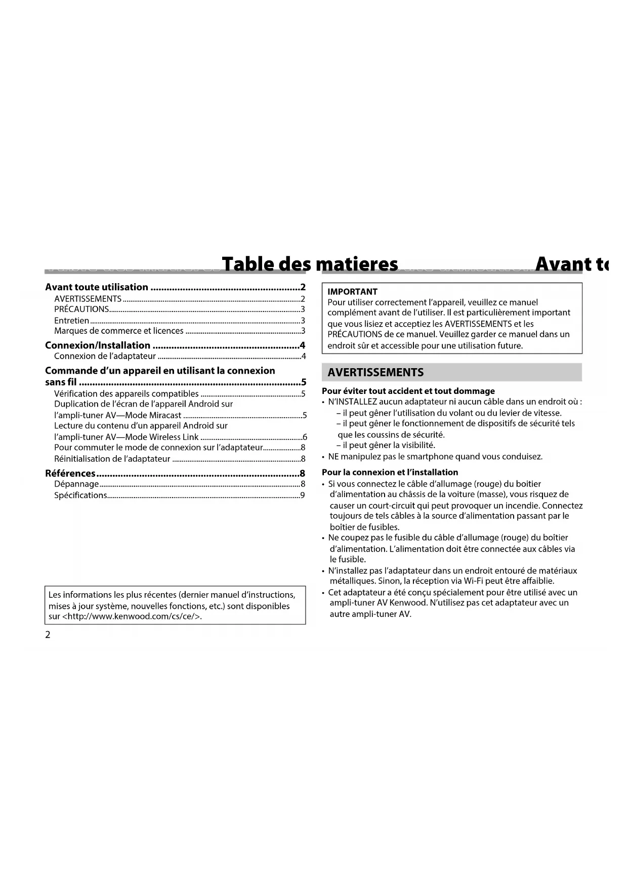 - Cet adaptateur a été conçu spécialement pour être utilisé avec un ampli-tuner AV Kenwood. N’utilisez pas cet adaptateur avec un autre ampli-tuner AV. Table des matieresTable des matieres Avant toute utilisation ........................................................2 AVERTISSEMENTS ..............................................................................................2 PRÉCAUTIONS ..................................................................................................... 3 Entretien ...............................................................................................................3 Marques de commerce et licences .............................................................3 Connexion/Installation .......................................................4 Connexion de l’adaptateur ............................................................................4 Commande d’un appareil en utilisant la connexion sans fil ...................................................................................5 Vérification des appareils compatibles .....................................................5 Duplication de l’écran de l’appareil Android sur l’ampli-tuner AV—Mode Miracast ...............................................................5 Lecture du contenu d’un appareil Android sur l’ampli-tuner AV—Mode Wireless Link ......................................................6 Pour commuter le mode de connexion sur l’adaptateur....................8 Réinitialisation de l’adaptateur ....................................................................8 Références ............................................................................8 Dépannage .......................................................................................................... 8 Spécifications ......................................................................................................9 Les informations les plus récentes (dernier manuel d’instructions, mises à jour système, nouvelles fonctions, etc.) sont disponibles sur <http://www.kenwood.com/cs/ce/>. BookENKCA-WL100W.indb2Book EN KCA WL100 W indb 2 2015/06/2511:292015/06/25 11:29FRANÇAIS 3 Avant toute utilisationAvant toute utilisation PRÉCAUTIONS Pour la connexion et l’installation
