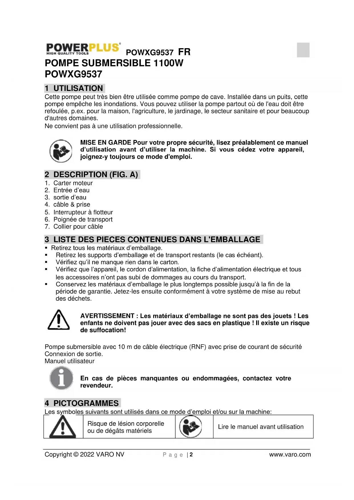 - Stationnaire avec conduite en tuyaux souples Attention: En installant la pompe, il ne faut jamais l'accrocher sans support sur la conduite de pression ou sur le câble secteur. Accrochez la pompe à moteur submersible par la poignée prévue à cet effet, ou déposez-la sur le fond du puits. Afin d'assurer le bon fonctionnement de la pompe, il faut que le fond du puits soit toujours exempt de boue ou d'autres impuretés. Dans le cas d'un niveau d'eau trop bas, la boue déposée éventuellement sur le fond du puits peut sécher et empêcher le démarrage de la pompe. Par conséquent, il est indispensable de contrôler la pompe à moteur submersible à intervalles réguliers.POWXG9537 FR Copyright © 2022 VARO NV P a g e | 4 www.varo.com (Faites des essais de démarrage.) L'interrupteur à flotteur est réglé de telle sorte que la mise en service est immédiatement possible. Remarque! Le puits d'épuisement doit avoir pour dimension au minimum 40 x 40 x 50 cm afin que l'interrupteur à flotteur puisse bouger librement. Branchement au réseau La pompe à moteur submersible que vous venez d'acquérir est munie d'une fiche de prise de courant de sécurité. La pompe est prévue pour être raccordée à une prise de sécurité de 220/230 volts/ 50 Hz. Assurez-vous que la prise est suffisamment protégée par fusibles (minimum 6 ampères) et en parfait état. Enfoncez la fiche de la pompe dans la prise et la pompe est prête à être mise en service. Note: Au cas où le câble secteur ou la fiche seraient endommagés par des éléments externes, il est absolument interdit de réparer le câble!