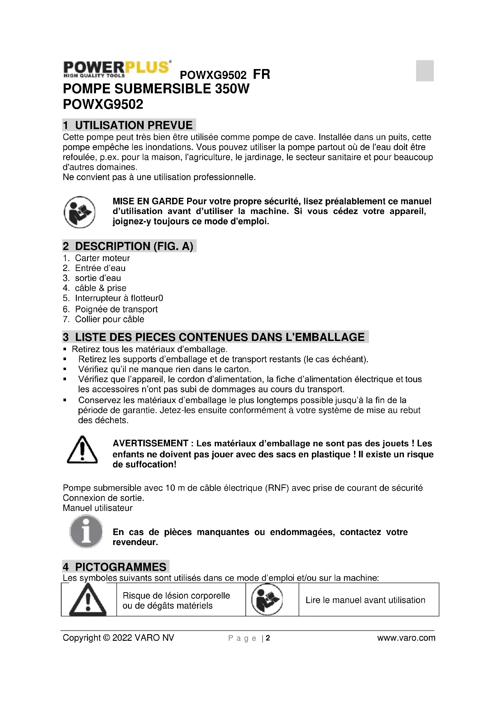 - Stationnaire avec conduite en tuyaux souples Attention: En installant la pompe, il ne faut jamais l'accrocher sans support sur la conduite de pression ou sur le câble secteur. Accrochez la pompe à moteur submersible par la poignée prévue à cet effet, ou déposez-la sur le fond du puits. Afin d'assurer le bon fonctionnement de la pompe, il faut que le fond du puits soit toujours exempt de boue ou d'autres impuretés. Dans le cas d'un niveau d'eau trop bas, la boue déposée éventuellement sur le fond du puits peut sécher et empêcher le démarrage de la pompe. Par conséquent, il est indispensable de contrôler la pompe à moteur submersible à intervalles réguliers. (Faites des essais de démarrage.) L'interrupteur à flotteur est réglé de telle sorte que la mise en service est immédiatement possible.POWXG9502 FR Copyright © 2022 VARO NV P a g e | 4 www.varo.com Remarque! Le puits d'épuisement doit avoir pour dimension au minimum 40 x 40 x 50 cm afin que l'interrupteur à flotteur puisse bouger librement. Branchement au réseau La pompe à moteur submersible que vous venez d'acquérir est munie d'une fiche de prise de courant de sécurité. La pompe est prévue pour être raccordée à une prise de sécurité de 220/230 volts/ 50 Hz. Assurez-vous que la prise est suffisamment protégée par fusibles (minimum 6 ampères) et en parfait état. Enfoncez la fiche de la pompe dans la prise et la pompe est prête à être mise en service. Note: Au cas où le câble secteur ou la fiche seraient endommagés par des éléments externes, il est absolument interdit de réparer le câble!