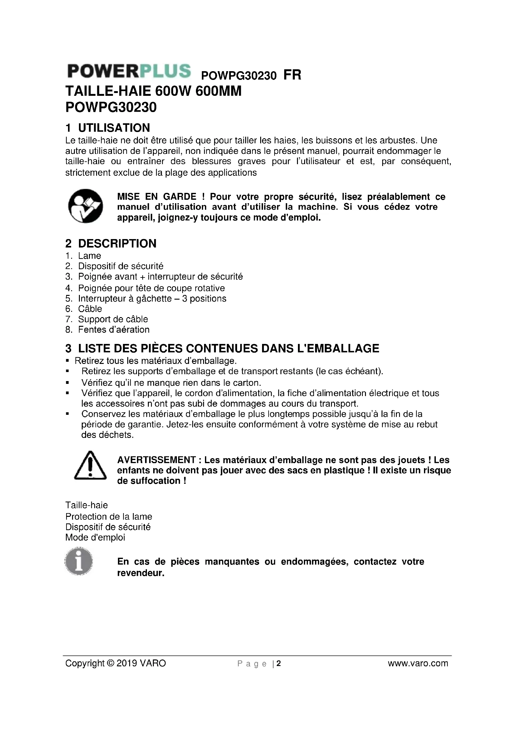- Vérifiez régulièrement votre machine avant de commencer le travail.POWPG30230 FR Copyright © 2019 VARO P a g e | 7 www.varo.com