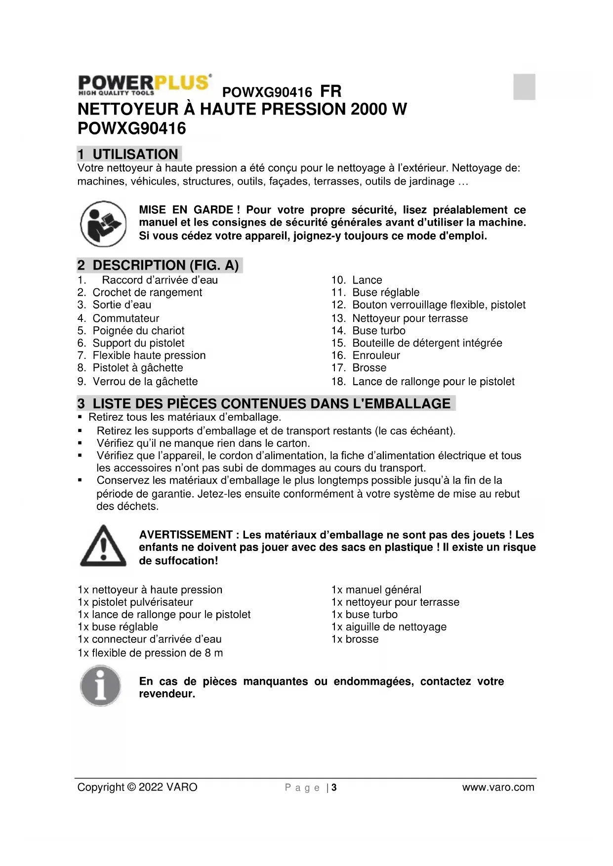 enfants ne doivent pas jouer avec des sacs en plastique ! Il existe un risque de suffocation! 1x nettoyeur à haute pression 1x pistolet pulvérisateur 1x lance de rallonge pour le pistolet 1x buse réglable 1x connecteur d’arrivée d’eau 1x flexible de pression de 8 m 1x manuel général 1x nettoyeur pour terrasse 1x buse turbo 1x aiguille de nettoyage 1x brosse En cas de pièces manquantes ou endommagées, contactez votre revendeur.POWXG90416 FR Copyright © 2022 VARO P a g e | 4 www.varo.com 4 PICTOGRAMMES Les symboles suivants sont utilisés dans ce mode d’emploi et/ou sur la machine :