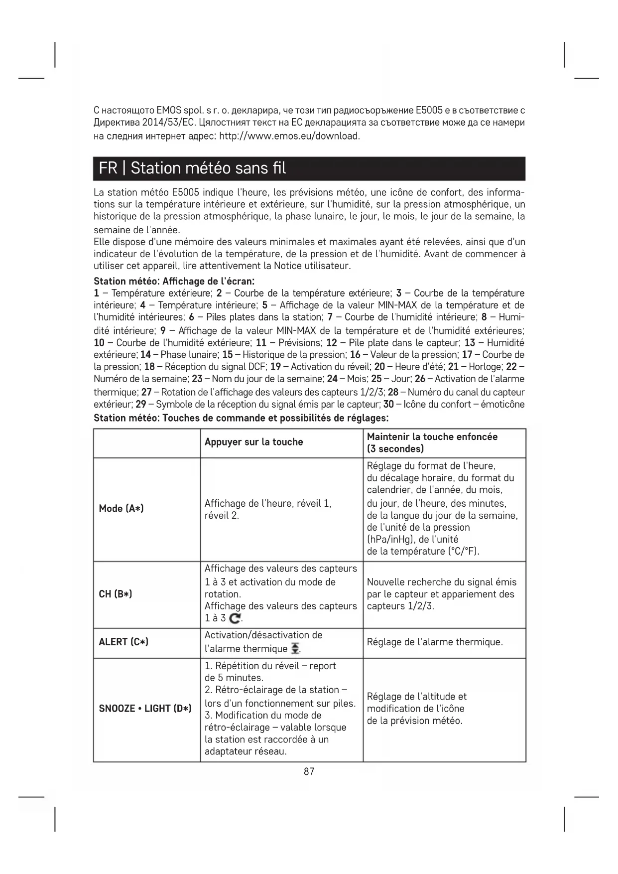 - Никоя част от настоящото ръководство не може да бъде възпроизвеждана без писменото съгласие на производителя. Не изхвърляйте електрически уреди с несортираните домакински отпадъци; предавайте ги в пунктовете за събиране на сортирани отпадъци. Актуална информация относно пункто- вете за събиране на сортирани отпадъци може да получите от компетентните местни орга- ни. При изхвърляне на електрически уреди на сметищата е възможно в подпочвените води да попаднат опасни вещества, които след това да преминат в хранителната верига и да увредят здравето на хората.87 C настоящото EMOS spol. s r. o. декларира, че този тип радиосъоръжение E5005 е в съответствие с Директива 2014/53/ЕС. Цялостният текст на ЕС декларацията за съответствие може да се намери на следния интернет адрес: http://www.emos.eu/download. FR | Station météo sans l La station météo E5005 indique l'heure, les prévisions météo, une icône de confort, des informa- tions sur la température intérieure et extérieure, sur l'humidité, sur la pression atmosphérique, un historique de la pression atmosphérique, la phase lunaire, le jour, le mois, le jour de la semaine, la semaine de l'année. Elle dispose d'une mémoire des valeurs minimales et maximales ayant été relevées, ainsi que d'un indicateur de l'évolution de la température, de la pression et de l'humidité. Avant de commencer à utiliser cet appareil, lire attentivement la Notice utilisateur. Station météo: Achage de l'écran: 1 – Température extérieure; 2 – Courbe de la température extérieure; 3 – Courbe de la température intérieure; 4 – Température intérieure; 5 – Achage de la valeur MIN-MAX de la température et de l'humidité intérieures; 6 – Piles plates dans la station; 7 – Courbe de l'humidité intérieure; 8 – Humi- dité intérieure; 9 – Achage de la valeur MIN-MAX de la température et de l'humidité extérieures; 10 – Courbe de l'humidité extérieure; 11 – Prévisions; 12 – Pile plate dans le capteur; 13 – Humidité extérieure; 14 – Phase lunaire; 15 – Historique de la pression; 16 – Valeur de la pression; 17 – Courbe de la pression; 18 – Réception du signal DCF; 19 – Activation du réveil; 20 – Heure d'été; 21 – Horloge; 22 – Numéro de la semaine; 23 – Nom du jour de la semaine; 24 – Mois; 25 – Jour; 26 – Activation de l'alarme thermique; 27 – Rotation de l'achage des valeurs des capteurs 1/2/3; 28 – Numéro du canal du capteur extérieur; 29 – Symbole de la réception du signal émis par le capteur; 30 – Icône du confort – émoticône Station météo: Touches de commande et possibilités de réglages: Appuyer sur la touche Maintenir la touche enfoncée (3 secondes) Mode (A*) Affichage de l'heure, réveil 1, réveil 2. Réglage du format de l'heure, du décalage horaire, du format du calendrier, de l'année, du mois, du jour, de l'heure, des minutes, de la langue du jour de la semaine, de l'unité de la pression (hPa/inHg), de l'unité de la température (°C/°F). CH (B*) Affichage des valeurs des capteurs 1 à 3 et activation du mode de rotation. Affichage des valeurs des capteurs 1 à 3