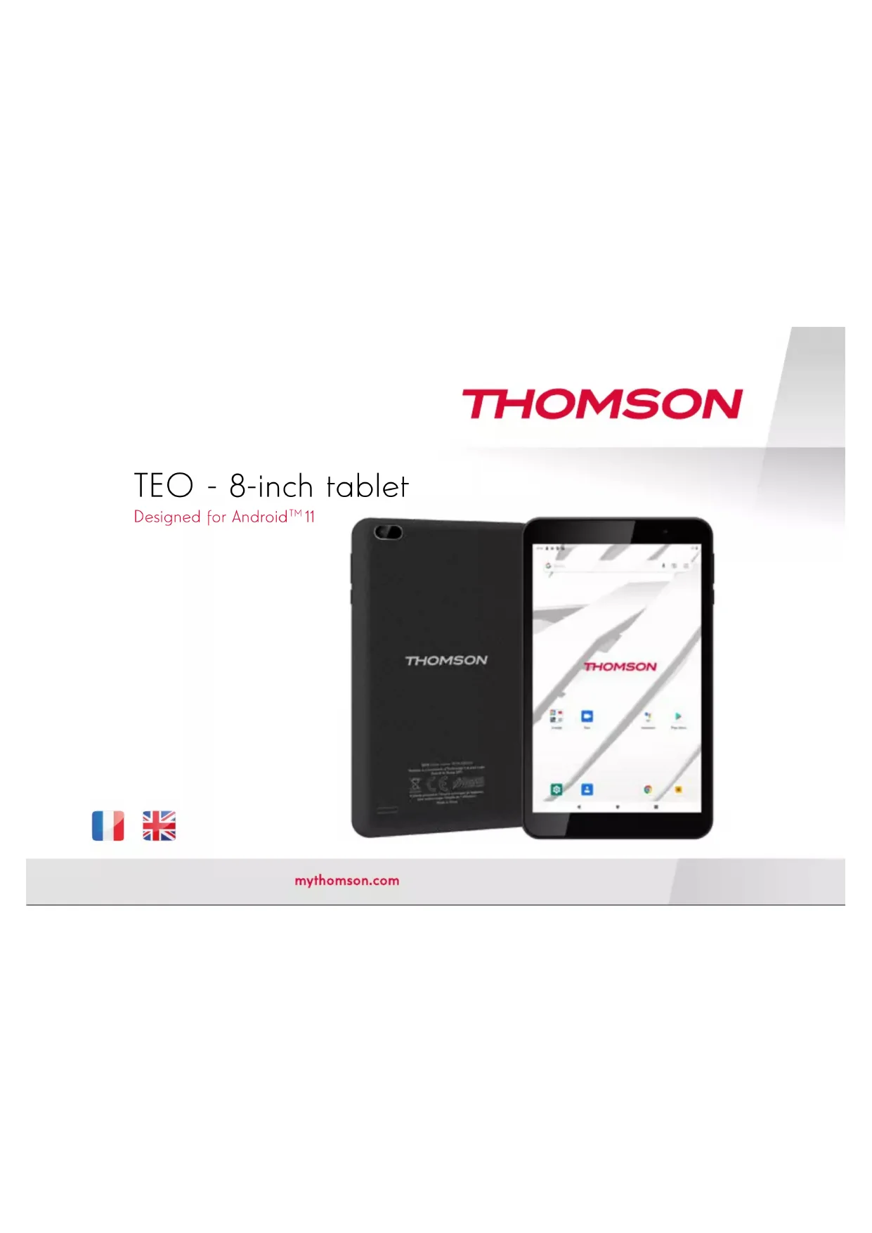 pour dénir les autres troubles avant de nous retourner le MID / Tablet PC : Etape 1 : Utiliser une aiguille ou un trombone pour réinitia- liser l’appareil sur le côté, puis vériez si la tablette fonc- tionne correctement Etape 2 : Mettre à jour le rmware du PC et redémarrer l’ap- pareil, puis vériez si la tablette fonctionne correctement14 Caractéristiques Processeur Rockchip RK3326 RAM 2GB DDR3 Stockage 8/16/32/64Go de mémoire ash intégrée (selon modèle) logement pour carte microSD (jusqu’à 32 Go pris en charge) Écran IPS 8” (1280 x 800), Écran tactile capacitif multitouch 5 points Réseau Wi-Fi LAN 802.11 b/g/n Sortie audio Casque 3,5 mm Interface PC Micro USB x1 Fonctionnalités Additionnelles Microphone intégré Appareil photo avant (VGA) - arrière (2 MP) Haut-parleur 1 x 1,0 W Alimentation Batterie rechargeable Li-poly 3,7 V / 4000 mAh Adaptateur (secteur 5V, 2A) Mentions légales et avis de copyright This product has been manufactured and sold under the responsi- bility of Group SFIT. THOMSON, and the THOMSON logo are trademarks of Technicolor (S.A.) or its afiates and are used under license by Group SFIT. Any other product, service, company, trade or product name and logo referenced herein are neither endorsed nor sponsored by Technicolor (S.A.) or its afiates. Google, Android, Google Play, YouTube and other marks are trad- marks of Google LLC. All other trademarks and logos are property of their respective owners unless indicated otherwise.TEO - 8-inch tablet Designed for Android