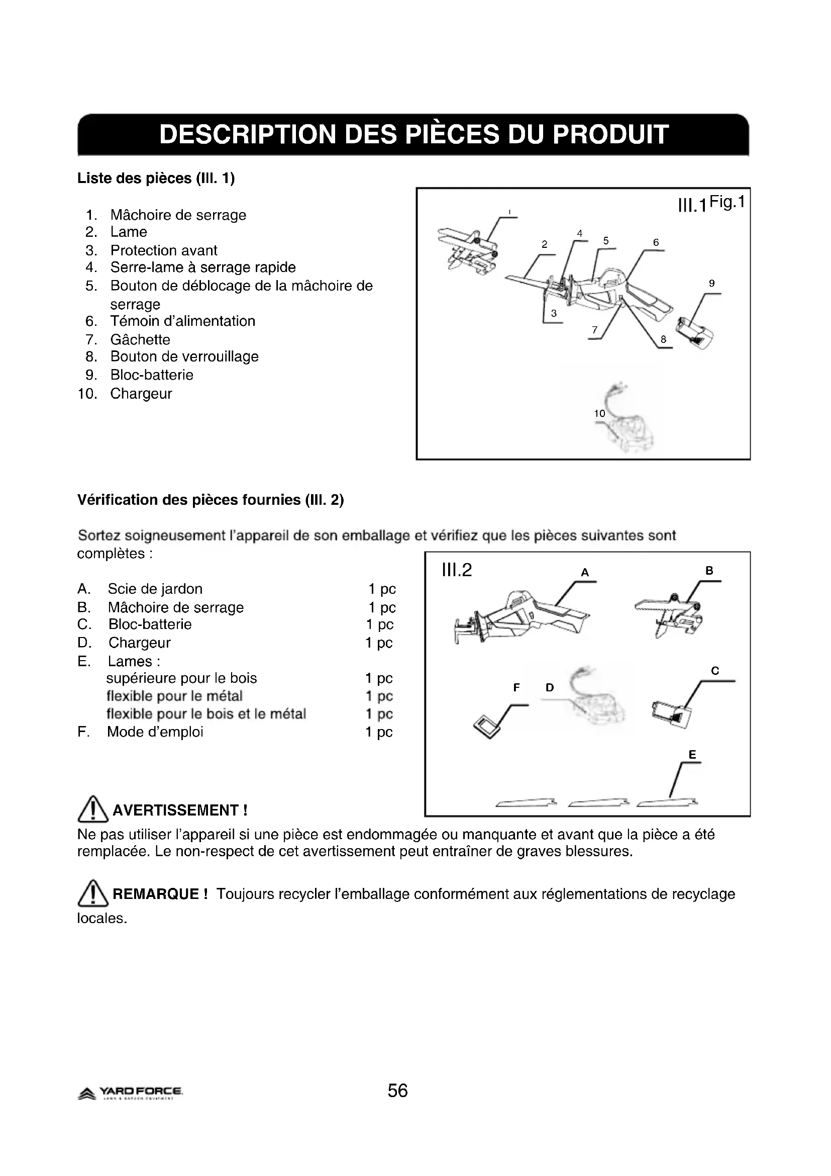 Vérification des pièces fournies (Ill. 2) complètes : A. Scie de jardon 1 pc B. Mâchoire de serrage 1 pc C. Bloc-batterie 1 pc D. Chargeur 1 pc E. Lames : supérieure pour le bois 1 pc F. Mode d’emploi 1 pc AVERTISSEMENT ! Ne pas utiliser l’appareil si une pièce est endommagée ou manquante et avant que la pièce a été remplacée. Le non-respect de cet avertissement peut entraîner de graves blessures. REMARQUE ! Toujours recycler l’emballage conformément aux réglementations de recyclage locales. III.1