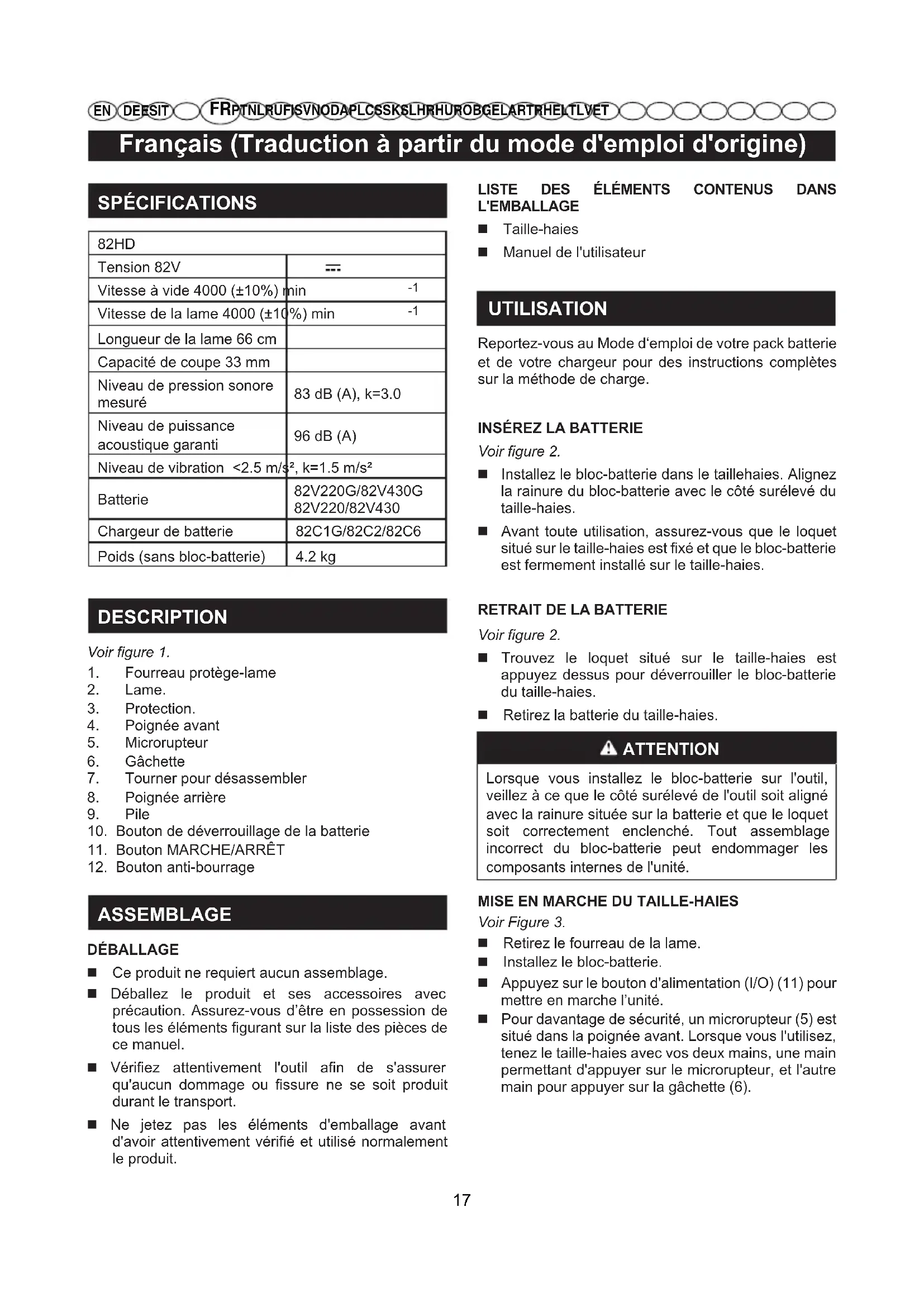 Longueur de la lame 66 cm Capacité de coupe 33 mm Niveau de pression sonore mesuré 83 dB (A), k=3.0 Niveau de puissance acoustique garanti 96 dB (A) Niveau de vibration <2.5 m/s², k=1.5 m/s² Batterie 82V220G/82V430G 82V220/82V430 Chargeur de batterie 82C1G/82C2/82C6 Poids (sans bloc-batterie) 4.2 kg DESCRIPTION Voir figure 1.