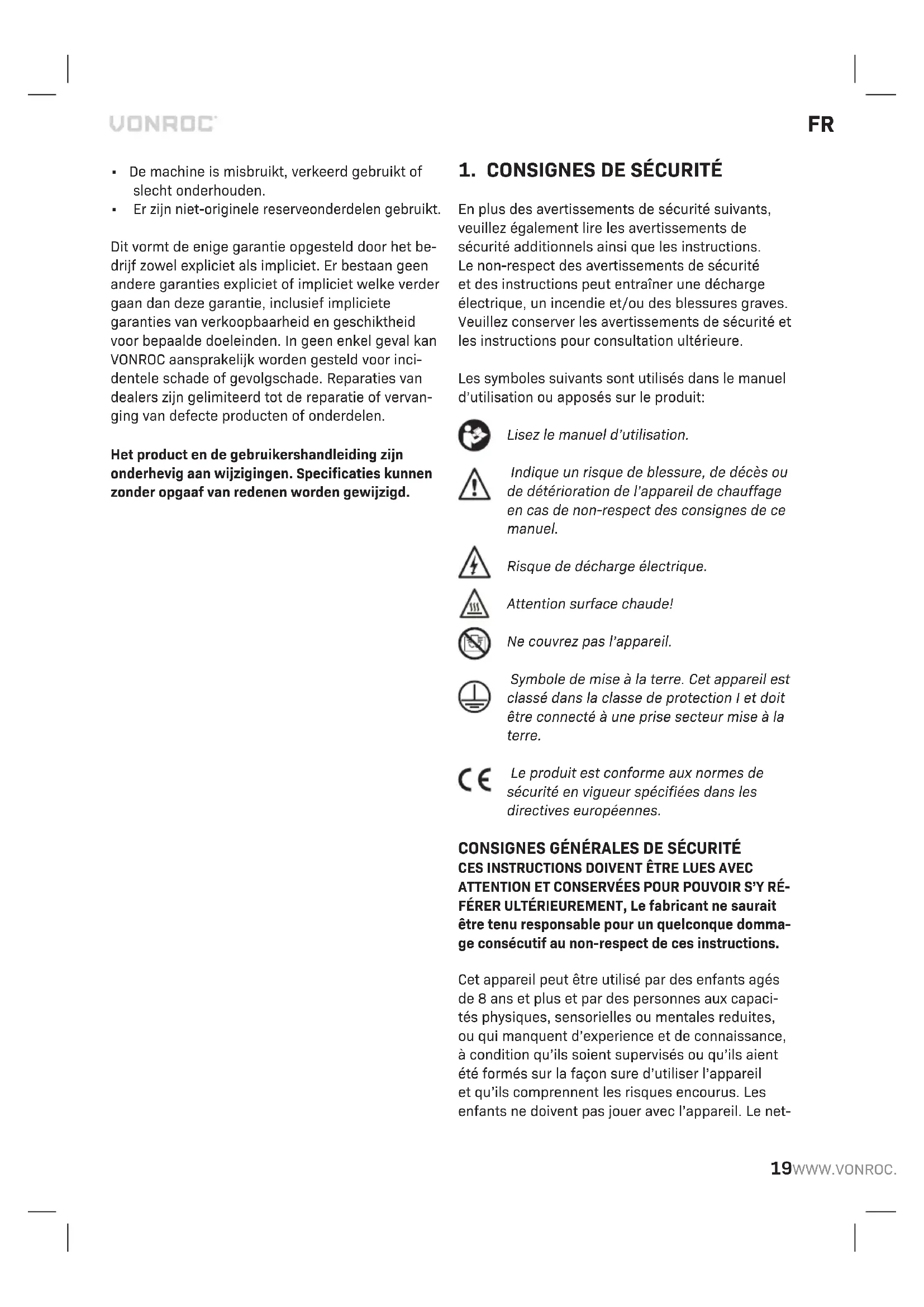 - Assurez-vous que les interrupteurs sont bien en position Marche, choisissez un niveau de réglage. ENVIRONNEMENT Les équipements électroniques ou électriques défectueux ou destinés à être mis au rebut doivent être déposés aux points de recyclage appropriés. Uniquement pour les pays de l’UE Ne jetez pas les outils électriques avec les déchets domestiques. Selon la Directive européenne 2012/19/CE relative aux déchets d’équipements électriques et électroniques et sa mise en œuvre dans le droit national, les outils électriques hors d’usage doivent être collectés séparément et mis au rebut de manière écologique. GARANTIE Les produits VONROC sont développés aux plus hauts standards de qualité et ils sont garantis contre les défauts de pièces et de main d’oeuvre pendant la durée légale stipulée à partir de la date d’achat d’origine du produit. En cas d’une quelconque panne du produit pendant cette durée qui serait due à un défaut matériel et/ou de main d’oeuvre, contactez directement VONROC. Les circonstances suivantes ne sont pas prises en charge par la garantie: