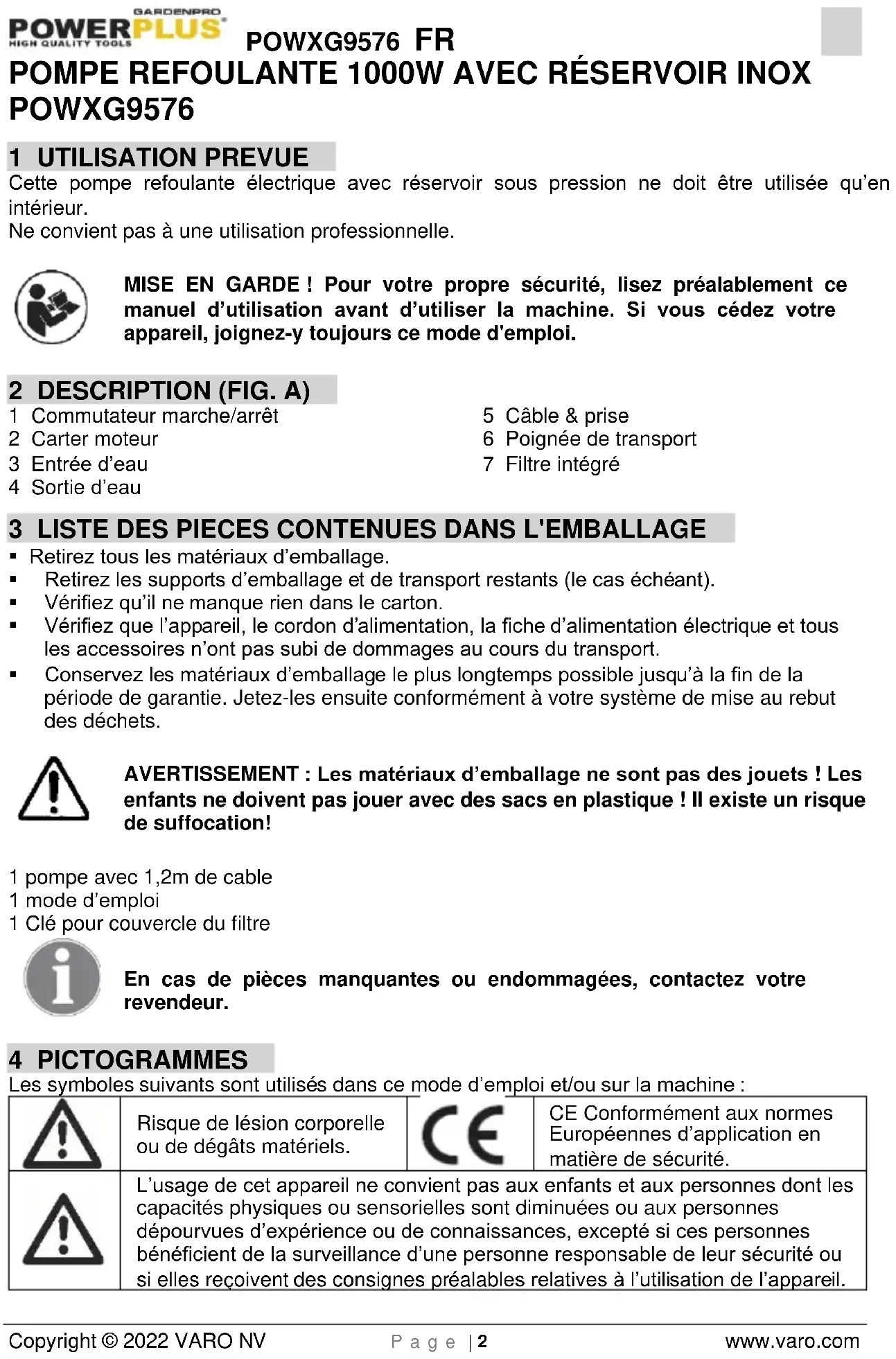 Copyright © 2022 VARO NV P a g e | 2 www.varo.com POMPE REFOULANTE 1000W AVEC RÉSERVOIR INOX POWXG9576 1 UTILISATION PREVUE Cette pompe refoulante électrique avec réservoir sous pression ne doit être utilisée qu’en intérieur. Ne convient pas à une utilisation professionnelle. MISE EN GARDE ! Pour votre propre sécurité, lisez préalablement ce manuel d’utilisation avant d’utiliser la machine. Si vous cédez votre appareil, joignez-y toujours ce mode d'emploi. 2 DESCRIPTION (FIG. A) 1 Commutateur marche/arrêt 2 Carter moteur 3 Entrée d’eau 4 Sortie d’eau 5 Câble & prise 6 Poignée de transport 7 Filtre intégré