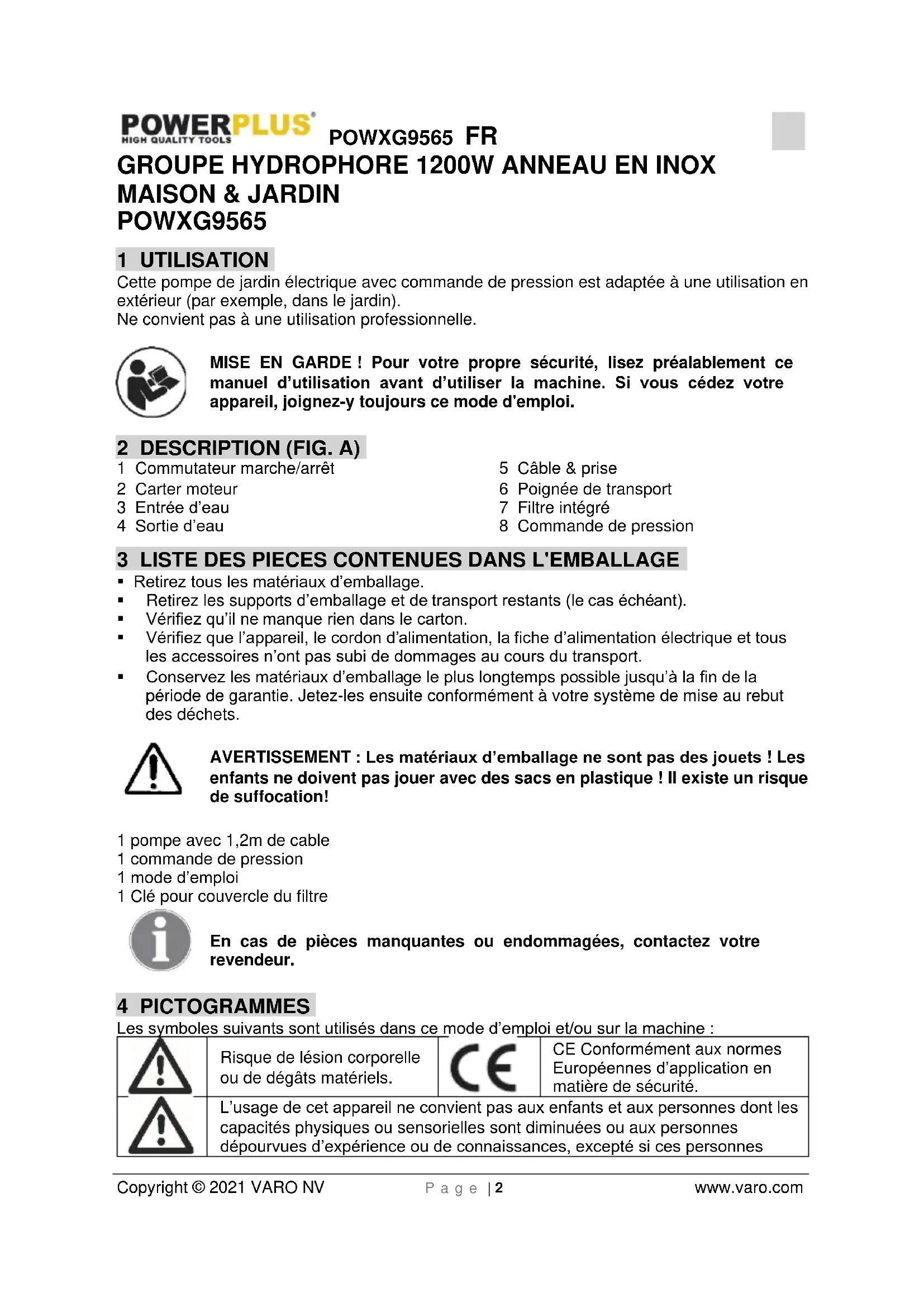 VARO N.V. - Vic. Van Rompuy N.V.- Joseph Van Instraat 9 - BE2500 Lier - BELGIQUE, déclare que : Appareil : Groupe Hydrophore 1200W Anneau En Inox Maison & Jardin Marque : POWERplus Modèle : POWXG9565 est en conformité avec les exigences essentielles et les autres dispositions pertinentes des Directives européennes applicables, basées sur l'application des normes européennes harmonisées. Toute modification non autorisée de l'appareil annule cette déclaration. Directives européennes (y compris, le cas échéant, leurs amendements à la date de la signature) ; 2014/30/EC 2014/35/EC 2011/65/EU 2000/14/EC Annex V LwA Measured 82dB(A) Guaranteed 83dB(A) Normes européennes harmonisées (y compris, le cas échéant, leurs amendements à la date de la signature) ; EN60335-1 : 2012 EN60335-2-41 : 2003 EN55014-1 : 2017 EN55014-2 : 2015