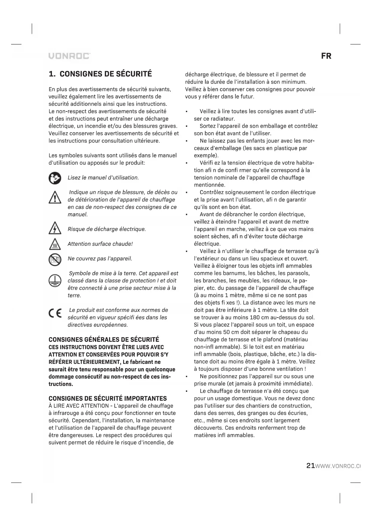 En plus des avertissements de sécurité suivants, veuillez également lire les avertissements de sécurité additionnels ainsi que les instructions. Le non-respect des avertissements de sécurité et des instructions peut entraîner une décharge électrique, un incendie et/ou des blessures graves. Veuillez conserver les avertissements de sécurité et les instructions pour consultation ultérieure. Les symboles suivants sont utilisés dans le manuel d’utilisation ou apposés sur le produit: Lisez le manuel d’utilisation. Indique un risque de blessure, de décès ou de détérioration de l’appareil de chauffage en cas de non-respect des consignes de ce manuel. Risque de décharge électrique. Attention surface chaude! Ne couvrez pas l’appareil. Symbole de mise à la terre. Cet appareil est classé dans la classe de protection I et doit être connecté à une prise secteur mise à la terre. Le produit est conforme aux normes de sécurité en vigueur spécifi ées dans les directives européennes. CONSIGNES GÉNÉRALES DE SÉCURITÉ
