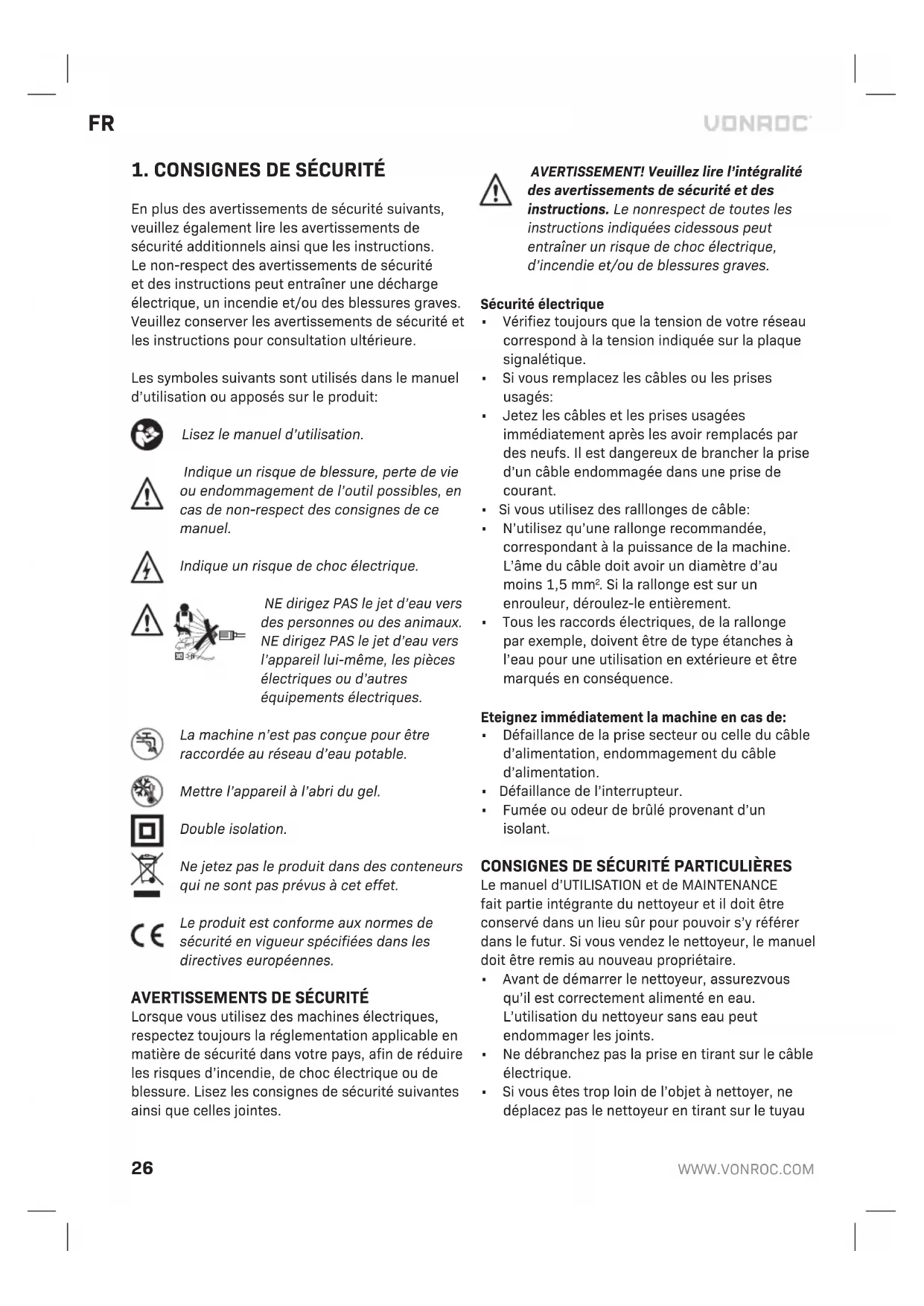 peut s’étendre au delà du contenu ici présent, y compris les garanties marchandes ou d’adaptation à des fins particulières. En aucun cas VONROC ne sera tenu responsable de dommages accidentels ou consécu tifs. Les solutions proposées par les revendeurs devront se limiter à la réparation ou le remplacement des éléments ou pièces non conformes. Le produit et le manuel d’utilisation sont sujets à modifications. Les spécifications peuvent changer sans préavis.