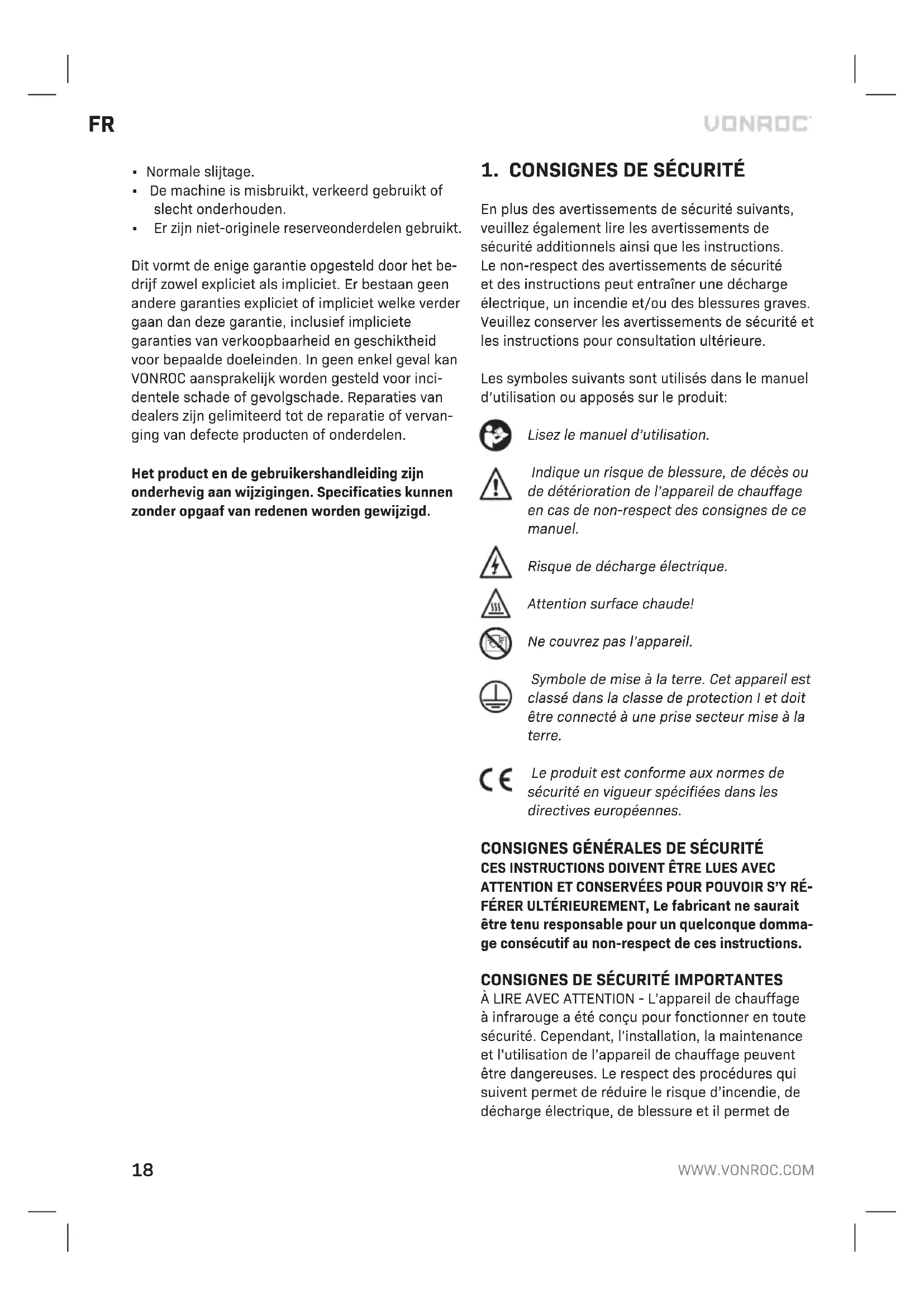 - Assurez-vous que les interrupteurs sont bien en position Marche, choisissez un niveau de réglage ENVIRONNEMENT Les équipements électroniques ou électriques défectueux ou destinés à être mis au rebut doivent être déposés aux points de recyclage appropriés. Uniquement pour les pays de l’UE Ne jetez pas les outils électriques avec les déchets domestiques. Selon la Directive européenne 2012/19/CE relative aux déchets d’équipements électriques et électroniques et sa mise en œuvre dans le droit national, les outils électriques hors d’usage doivent être collectés séparément et mis au rebut de manière écologique. GARANTIE Les produits VONROC sont développés aux plus hauts standards de qualité et ils sont garantis contre les défauts de pièces et de main d’oeuvre pendant la durée légale stipulée à partir de la date d’achat d’origine du produit. En cas d’une quelconque panne du produit pendant cette durée qui serait due à un défaut matériel et/ou de main d’oeuvre, contactez directement VONROC. Les circonstances suivantes ne sont pas prises en charge par la garantie: