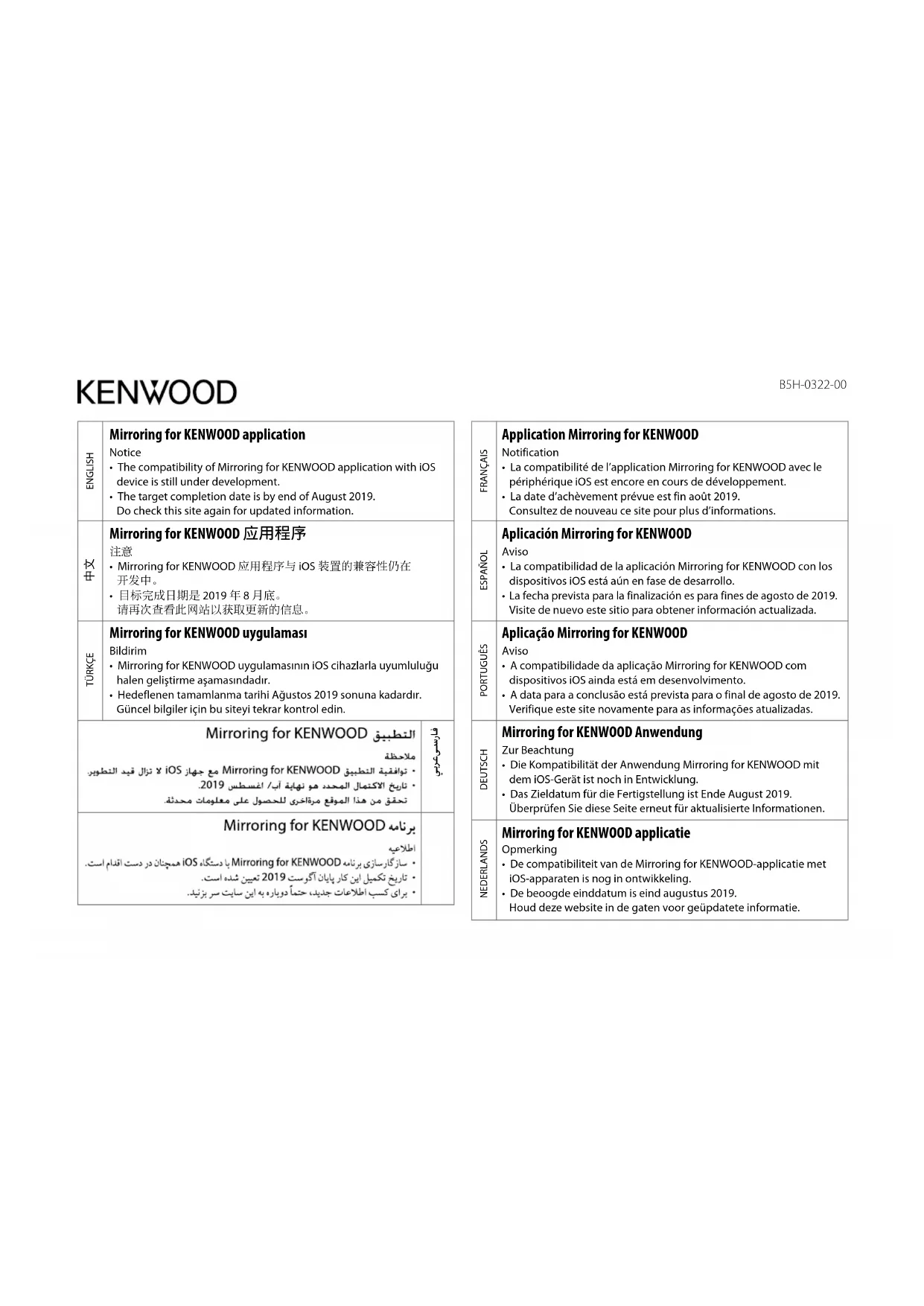 - La date d’achèvement prévue est fin août 2019. Consultez de nouveau ce site pour plus d’informations. ESPAÑOL Aplicación Mirroring for KENWOOD Aviso