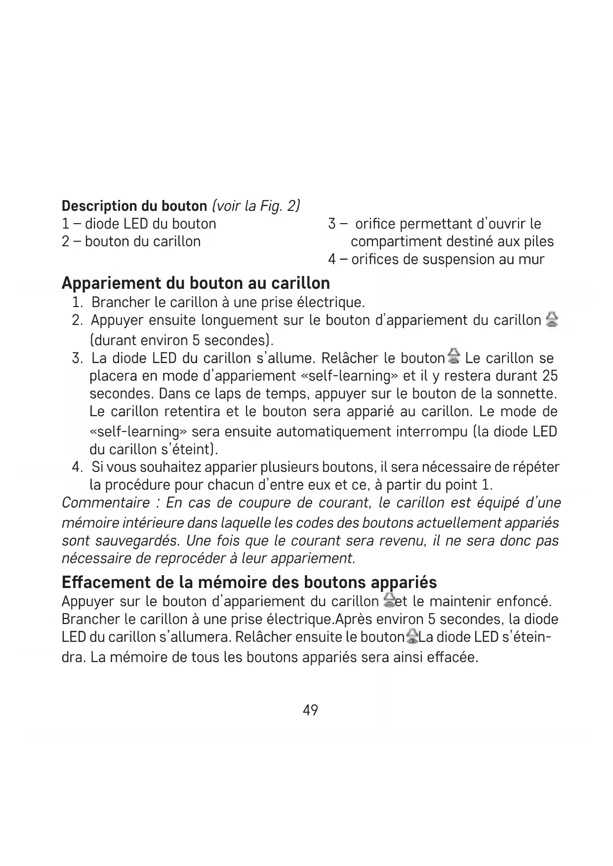 placera en mode d’appariement «self-learning» et il y restera durant 25 secondes. Dans ce laps de temps, appuyer sur le bouton de la sonnette. Le carillon retentira et le bouton sera apparié au carillon. Le mode de «self-learning» sera ensuite automatiquement interrompu (la diode LED du carillon s’éteint).